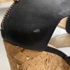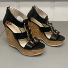 NEW Sexy Aldo Wedge Platform Strappy Sandal Cork Leather Black Gold Sz 8.5 Pair of NEW unworn wedge sandals. Old stock, some minor scuffs. Please see pictures. The platform at the front of shoe is approx 2” high. The back heel from floor to insole is approx 5.25”. Zipper feature in back at heel, zippers work.
