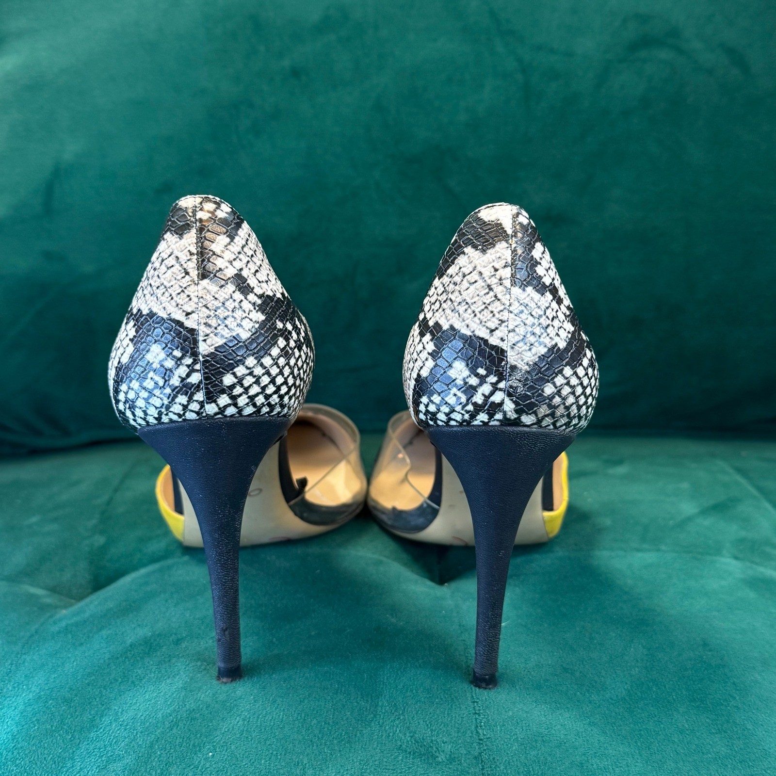 Striking and stylish heels from Aldo, perfect for adding a pop of color and texture to any outfit. These pumps feature a sleek pointed toe design with a clear vamp, complemented by a vibrant yellow and black color block. The ankle strap is adorned with a snakeskin print, adding a touch of exotic flair. The stiletto heel provides an elegant lift, making these shoes ideal for both day and evening wear. The interior is lined for comfort, and the sole is durable for lasting wear. Color: Black Style: Pump Department: Women Upper Material: Faux Leather Type: Heel Heel Style: Stiletto Toe Shape: Pointed Toe Heel Height: High (3-3.9 in) Pattern: Animal Print Closure: Buckle Features: Ankle Strap, Snakeskin Print, Stiletto Heel, Clear Vamp, Color Block Model: Aldo Snakeskin Stiletto Keywords: Aldo, heels, pumps, snakeskin, ankle strap, pointed toe, stiletto, yellow, black, color block, party heels, fashion heels, women's shoes, high heels Item is preowned, effort has been made to ensure all flaws are displayed photos serve as additional description Sizing varies by manufacturer and time period, please see measurements.