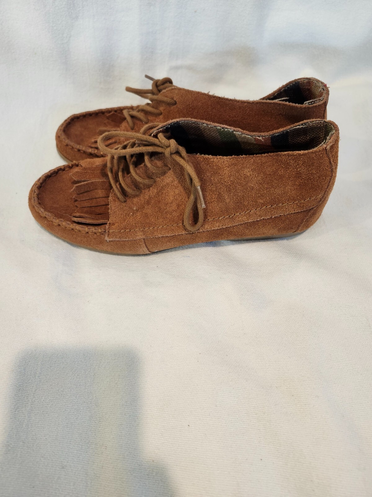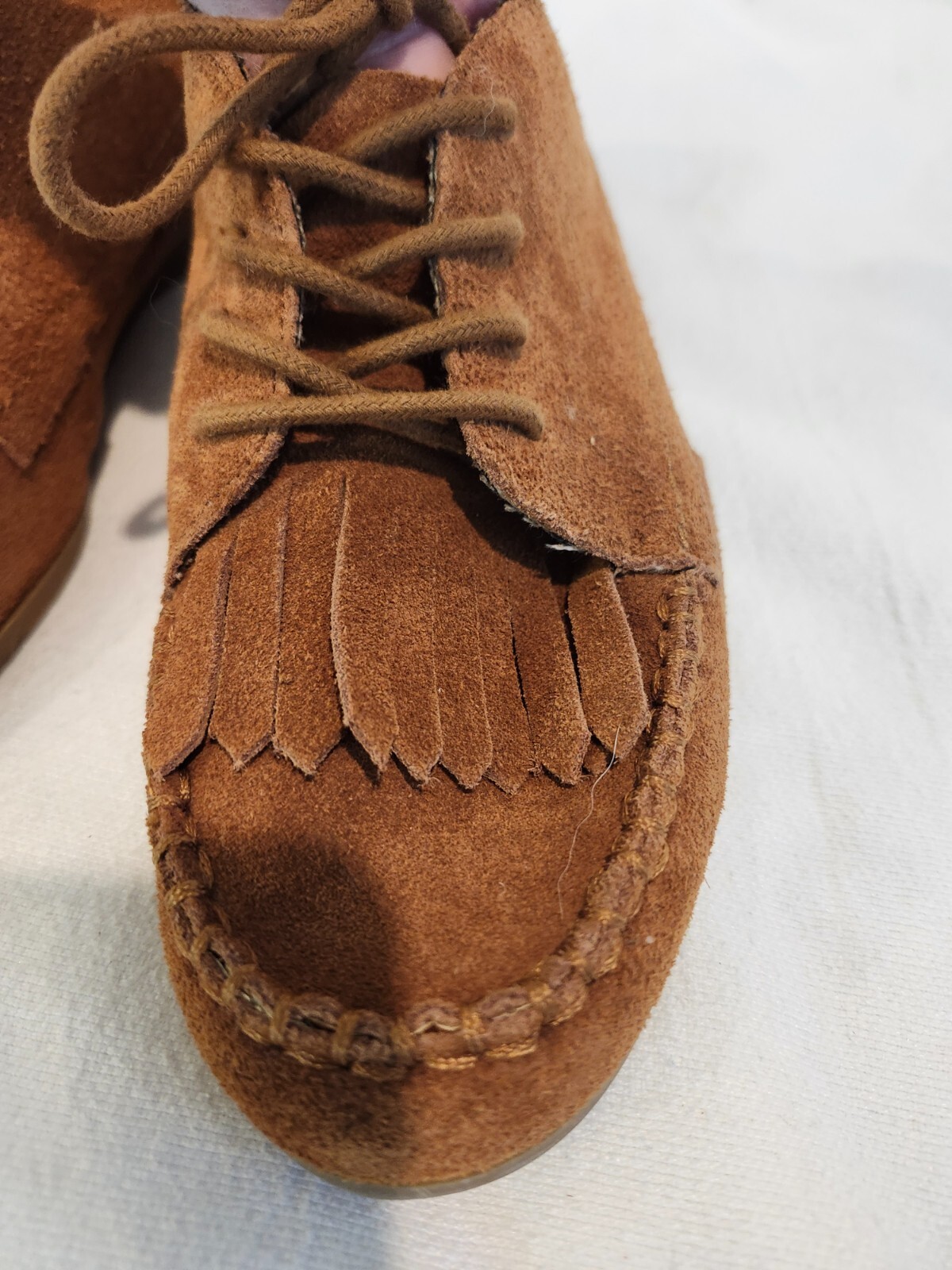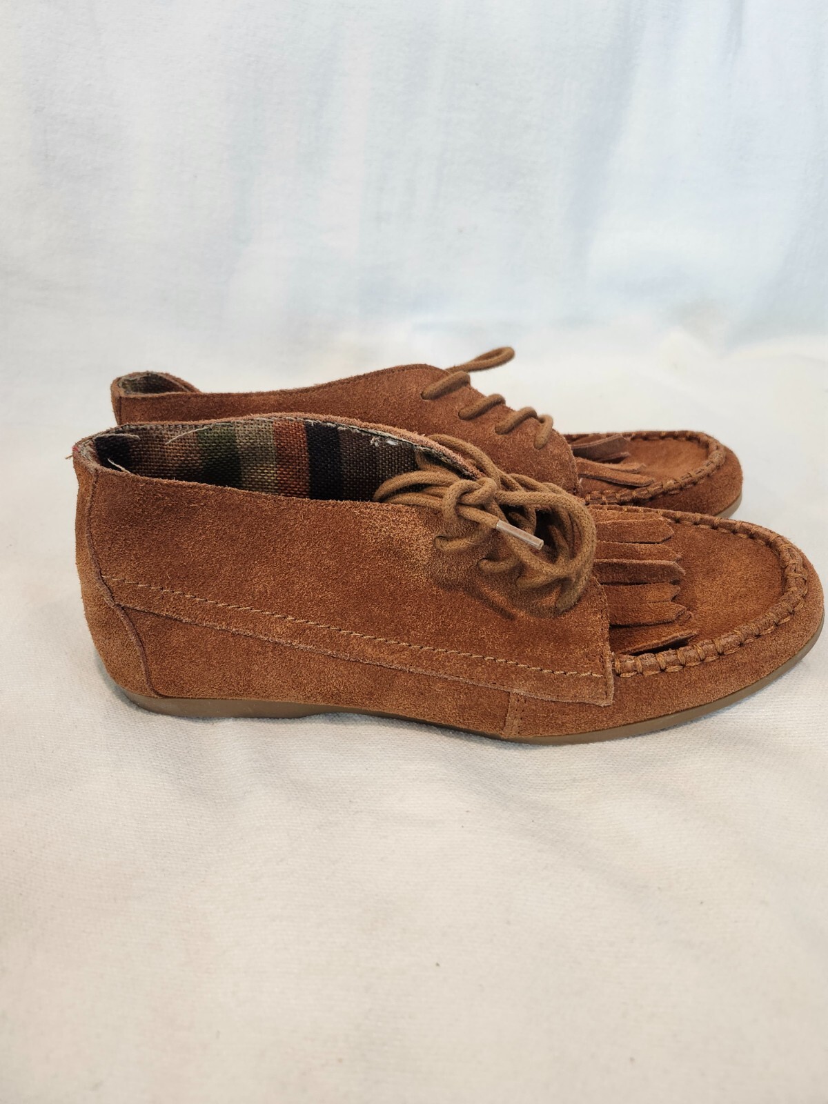 these are nice suede shoes with the fringed on the top of the shoe, lace up, almost like a moccasin shoe but up to the ankle. pre-owned.