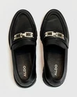 The Aldo Black Loafers are stylish women's shoes with a chunky heel and gold chain accents, making them a trendy and versatile choice. These slip-on loafers in size UK 5.5 / US 8 / EU 38.5 feature a round toe shape and are made from synthetic material, perfect for adding a touch of glam to any outfit. The black color and metal accents give these loafers a chic and sophisticated look, ideal for a night out or special occasion.