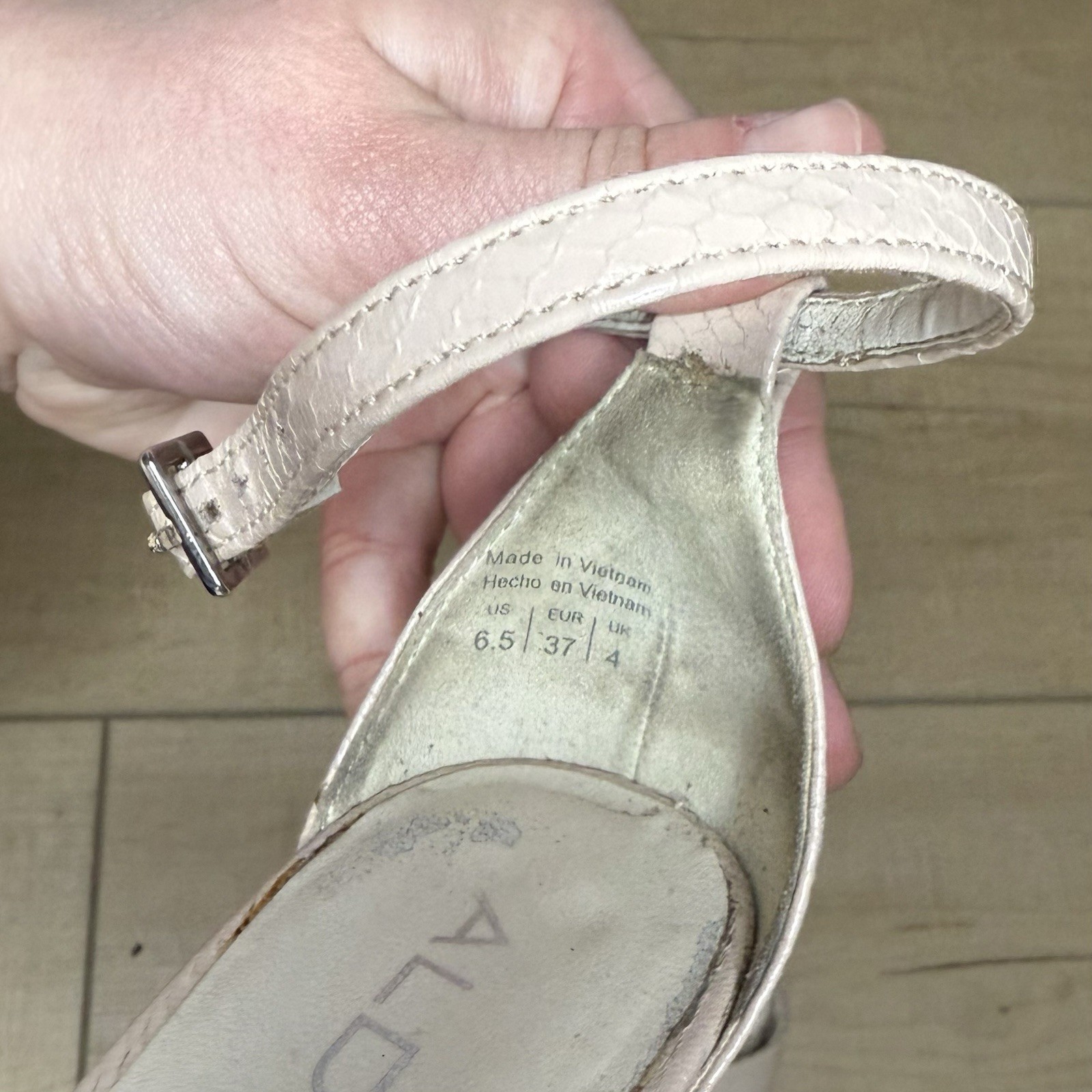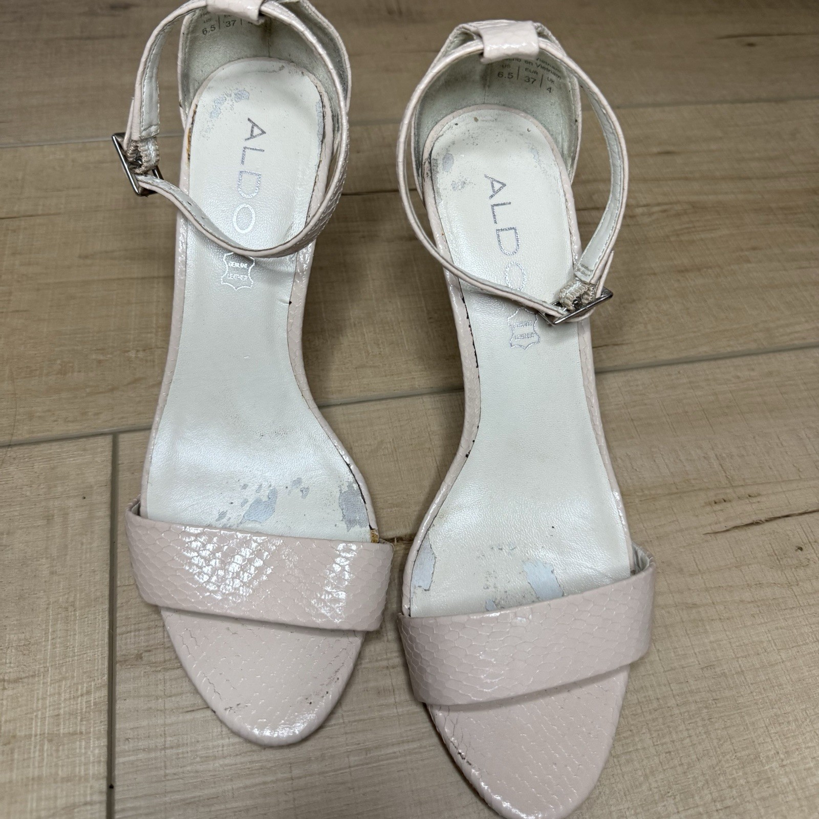 Size - 6.5 3” Heel Good Used Condition Some spots of breakdown on footbed, not able to be seen when worn The Aldo Strappy Nude Tan High Heels in women's size 6.5 are stylish and sophisticated addition to any wardrobe. Featuring a pointed toe and stiletto heel, these ankle strap heels exude elegance and glamour. Made of leather with a beige color, these high heels are perfect for adding a touch of luxury to any outfit. The buckle closure adds a trendy accent to the design, making these Aldo heels a must-have for fashion-forward women looking to make a statement. B5