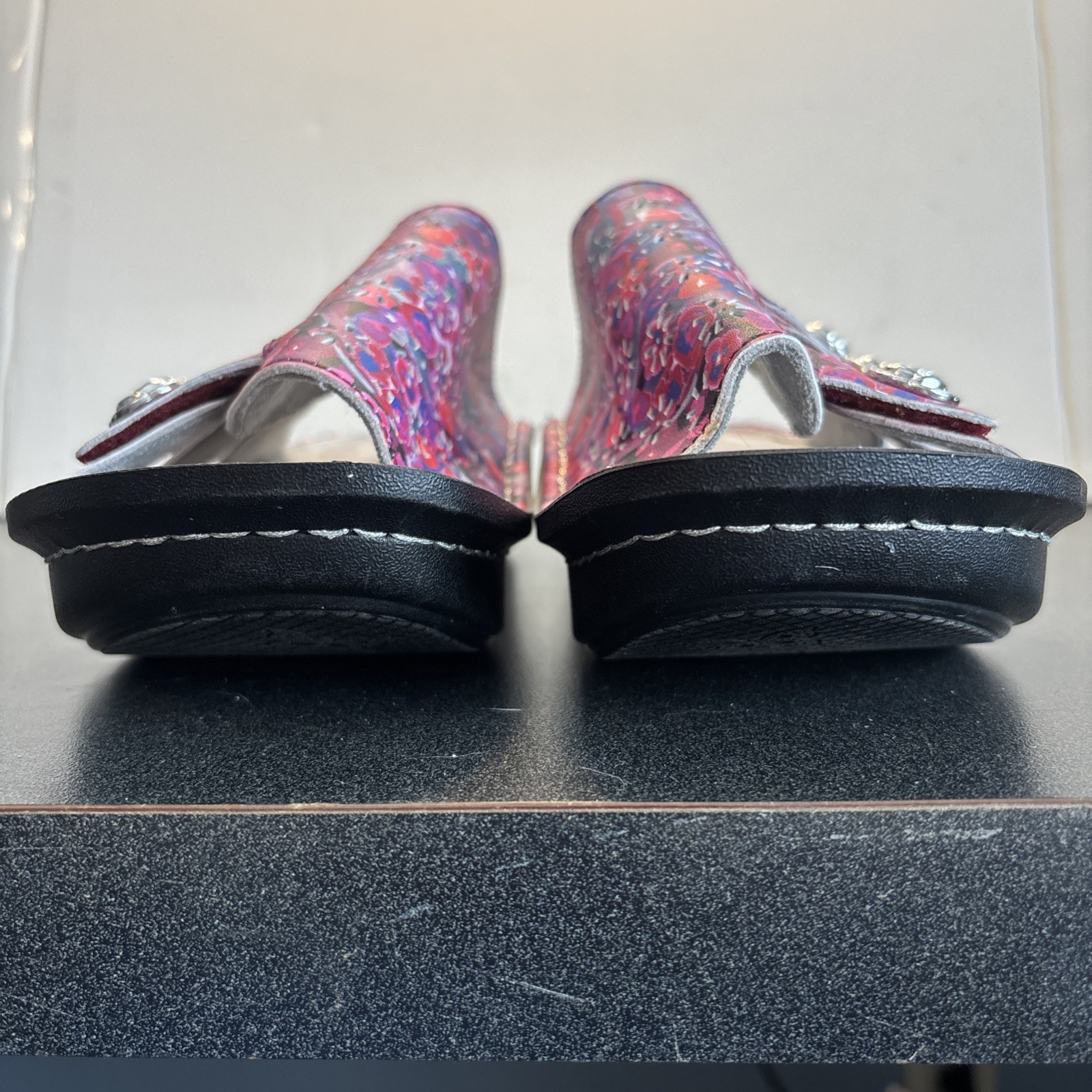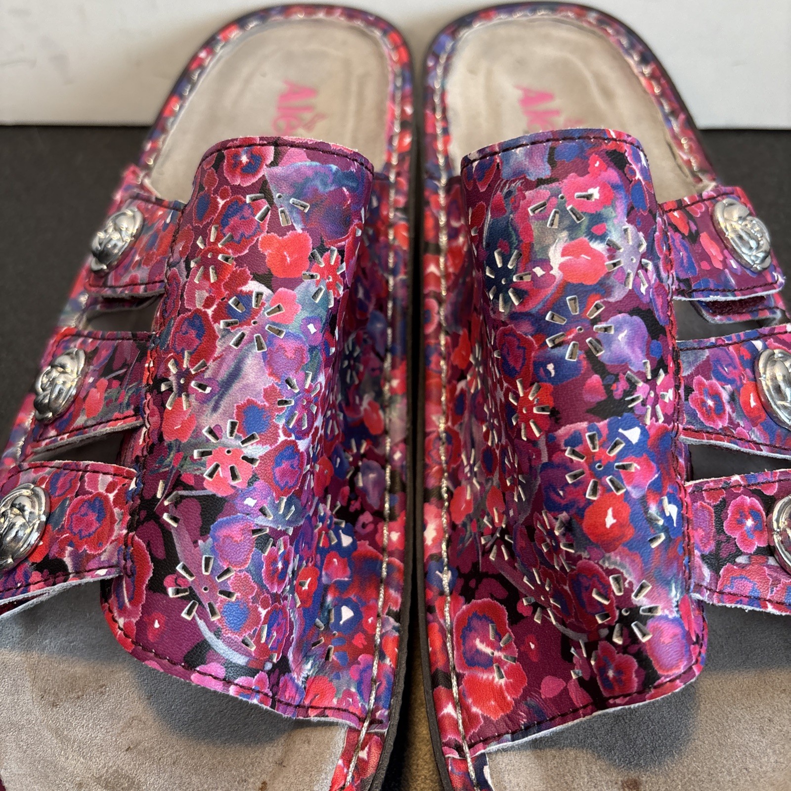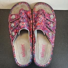 The Alegria Julee Poppy Pop sandals in pink, purple, and poppy accents are a stylish and comfortable choice for women. Featuring a low wedge heel and three strap design, these slip-on sandals are perfect for a casual day out. Made from leather, they offer both durability and a trendy touch. The EU size 39 and US size 8.5 ensure a perfect fit for a comfortable wear. Perfect for adding a pop of color to any outfit, these Alegria sandals are a must-have for any fashion-forward woman.