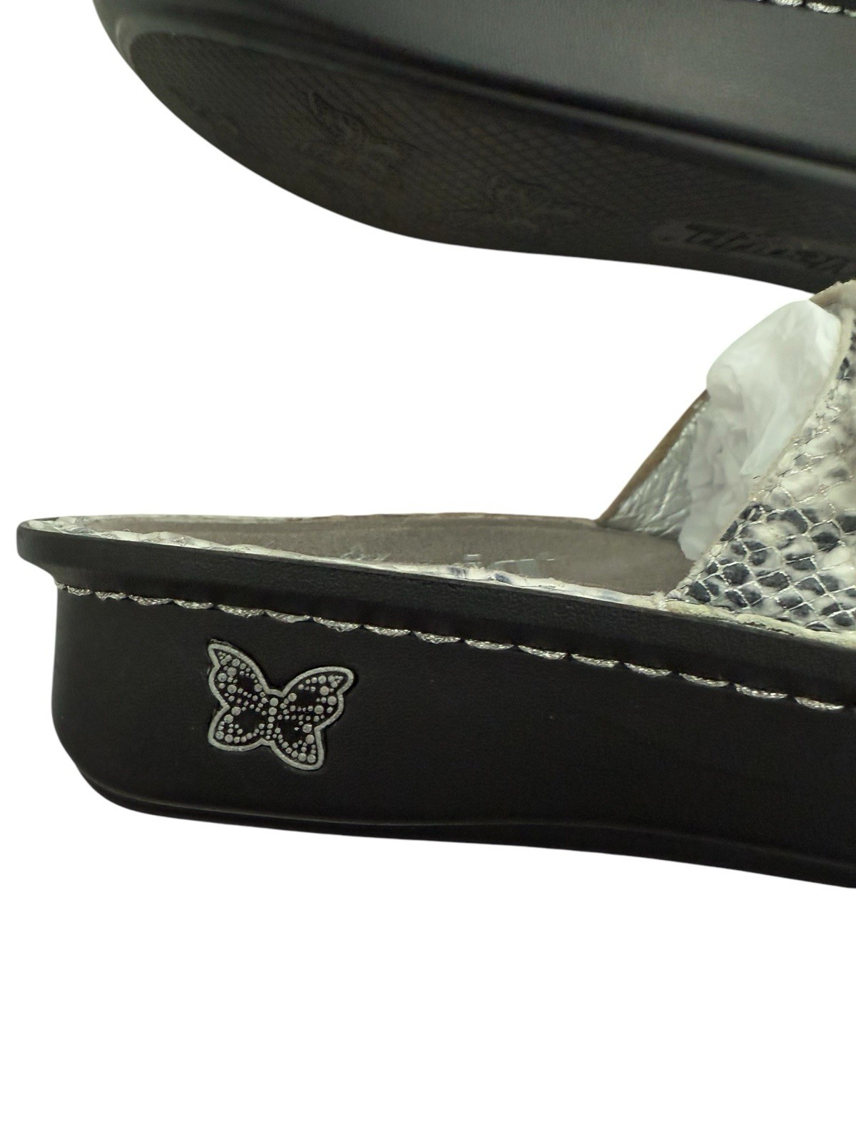 The Alegria Lite Women Fio Slide Snake Skin White Black Gray Leather Sandals are stylish and comfortable sandals for women. Perfect for various occasions, these sandals from Alegria are sure to add a touch of sophistication to any outfit. Size: 7 Condition: excellent( including soles)