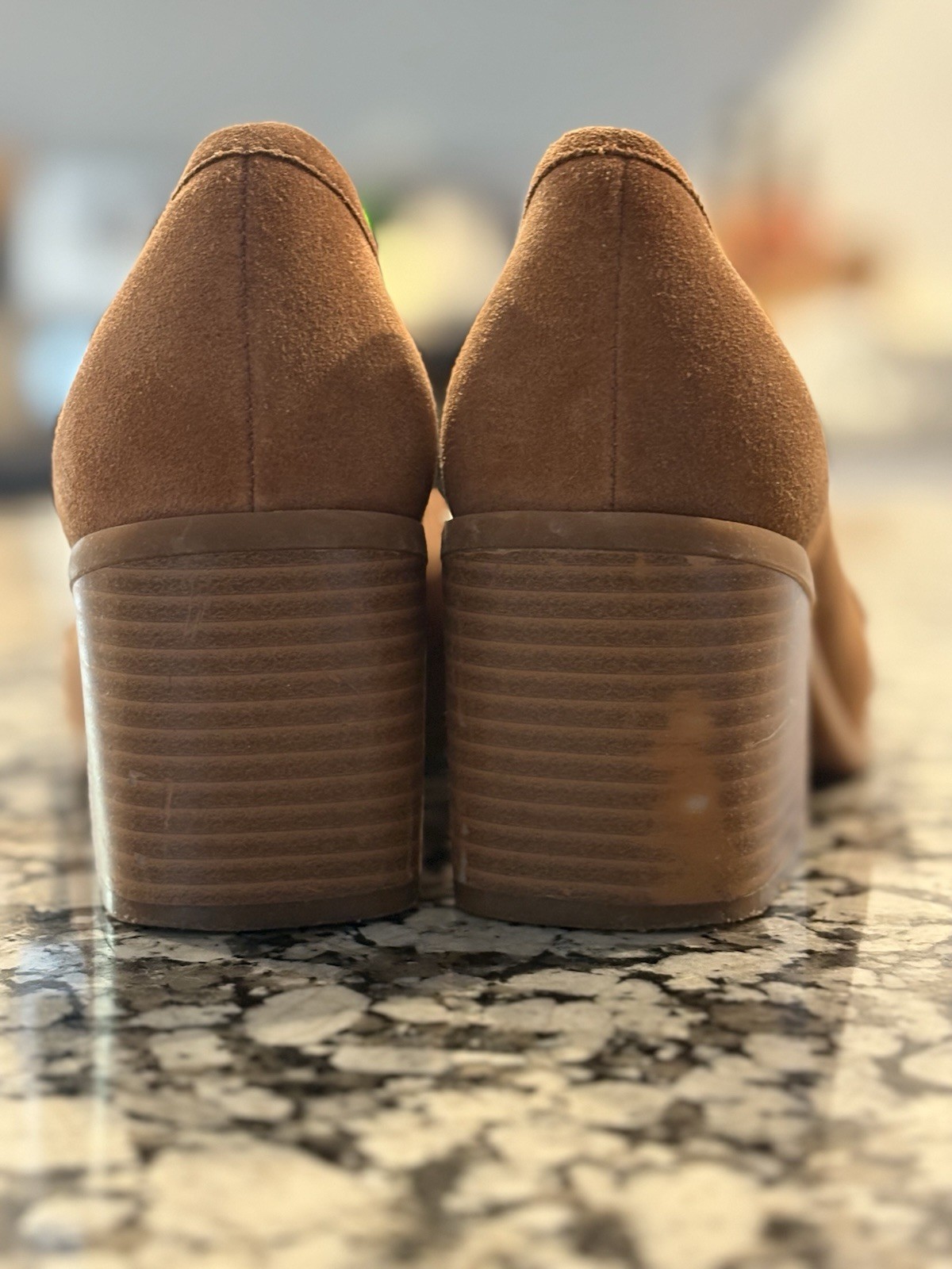 These shoes are like-new with minor scuffs on the back of the heel and some minor tread wear. The heel height is 3” when measured from the back of the heel. Feel free to message me with any questions!