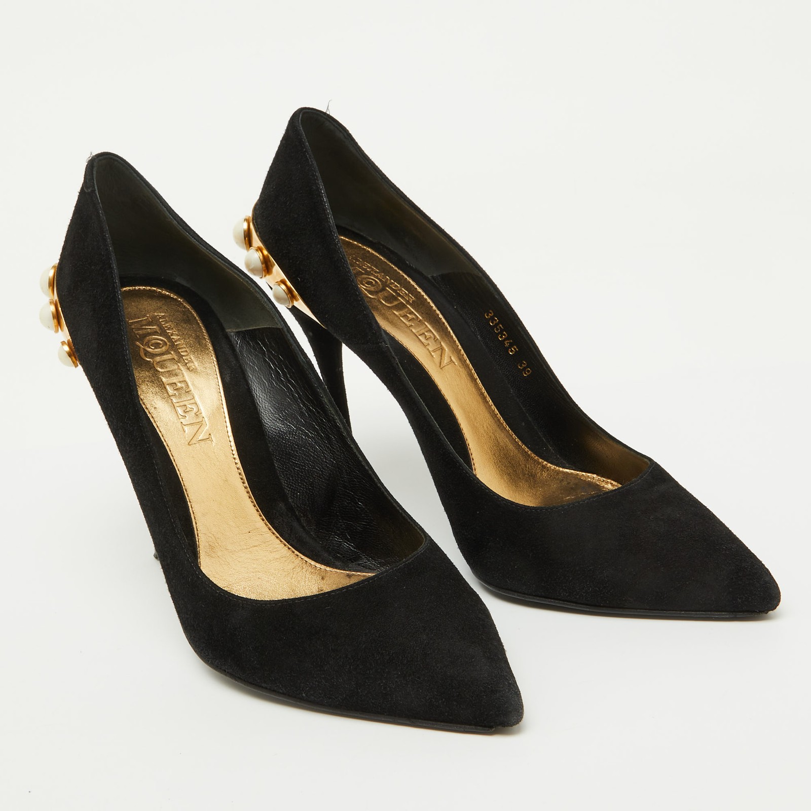 Make a chic style statement with these designer pumps. They showcase sturdy heels and durable soles, perfect for your fashionable outingsCertified by The Luxury Closet - This item has gone through a detailed authentication process overseen by our experts. We offer a lifetime guarantee of authenticity on all our items. Import duties, taxes and charges are not included in the item price. These charges are the buyers responsibility. Please check with your country’s customs office to determine what these additional cost will be prior to buying. Our eBay Store About Us Contact Us Add to Favorite Sellers Alexander McQueen Black Suede Gold Trimmed Faux Pearl Pumps Size 39 $203.5 Make a chic style statement with these designer pumps. They showcase sturdy heels and durable soles, perfect for your fashionable outings Product Details Brand Color Black Dimensions Material Suede Size 39 Outsole Width 8.5 cm Outsole Length 25 cm Heel Height 10.5 cm Includes The Luxury Closet Packaging Certified by The Luxury Closet This item has gone through a detailed authentication process overseen by our experts. We offer a lifetime guarantee of authenticity on all our items. How We Check The in-house team of experts at The Luxury Closet is highly trained to verify the authenticity and the condition of the luxury products. They ensure that only 100% authentic items are put on sale.The evaluation process is unique with its own mix of assessment criteria and differs according to the category. Each item is evaluated based on the following combination of hallmarks, hardware, stitching, symmetry, material, craftsmanship, stamping, codes, hologram stickers, and packaging. Our authenticators also check if the items have been modified or amended (e.g., aftermarket diamonds, replaced batteries, repaired bags, etc.) International Buyers Import duties, taxes and charges are not included in the item price. These charges are the buyers responsibility. Please check with your country’s customs office to determine what these additional cost will be prior to buying.