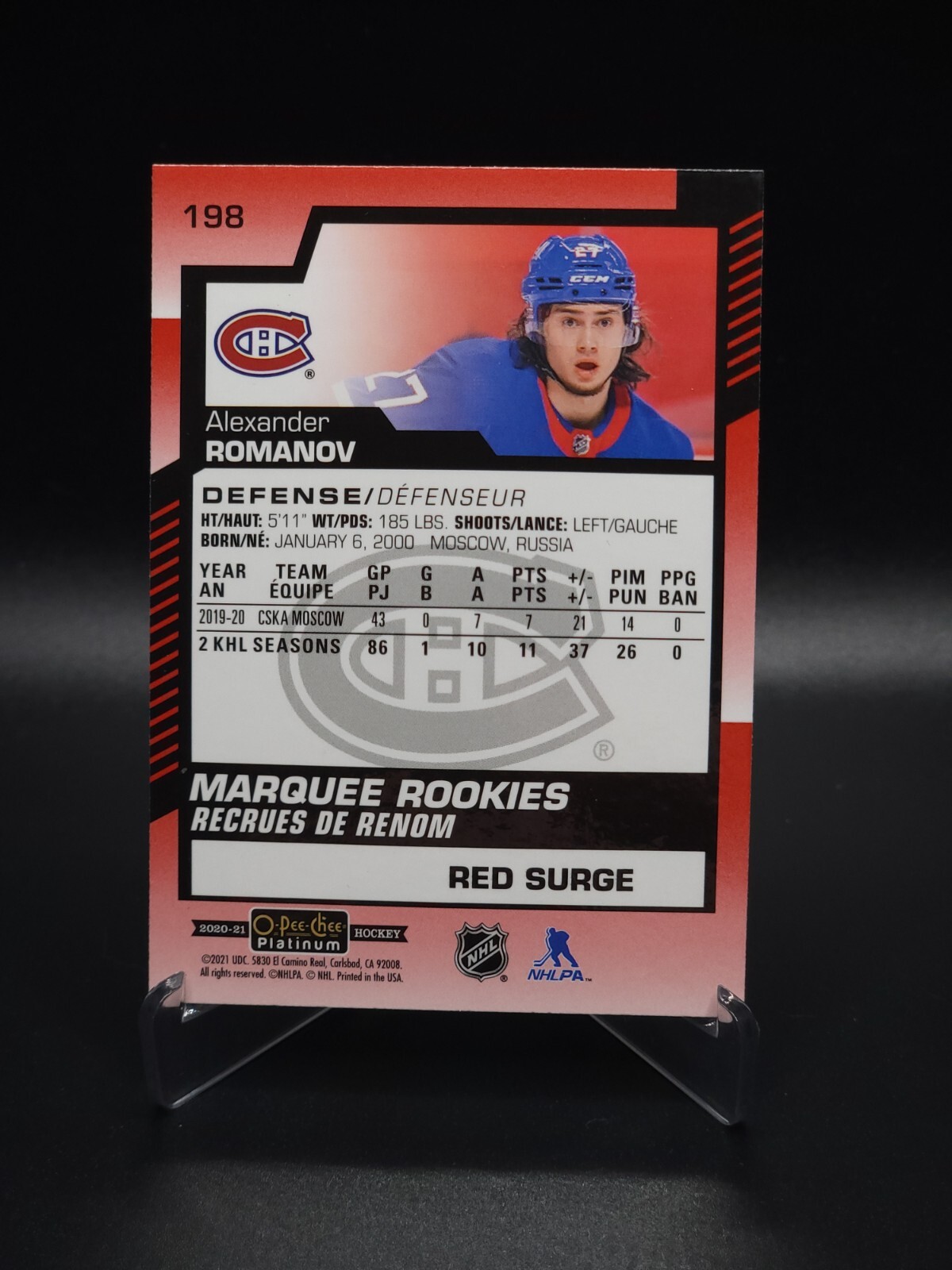 Alexander Romanov 2020-21 O-Pee-Chee Platinum Red Surge Marquee Rookies #198 NOTE: Does NOT include any stands shown in photos. Payment: Payment for all purchases is due within 72 hours. For International Buyers: I do not charge duty/taxes/customs fees because I have not control over whether or not your respective country will charge such a fee. As a result, I will not reimburse for assessed duty/taxes/customs fees if charged. Combined Shipping: I do offer combined shipping. In most cases, it will be $0.50/card after the initial main card shipping purchase. If the combined shipping was not available in the shopping cart, I will gladly provide a refund upon shipping preparation. If you placed an order for additional cards before first order shipped, I will add additional cards with combined shipping. What Shipping Pays For: - If Raw Card: Penny Sleeve, Top Loader, Team Bag, Cardboard Shipping Protectors, Painter's Tape, and Bubble Mailer with Shipping Tracking in most cases. - Ask about a cheaper shipping option! - If Graded Card: Team Bag, Cardboard Shipping Protectors, Painter's Tape, and Bubble Mailer with Shipping Tracking in most cases. Shipping Restrictions: Due to incoming shipping restrictions, global shipping will not mail to the following countries: Barbados, French Guiana, French Polynesia, Guadeloupe, Libya, Martinique, New Caledonia, Reunion, Russian Federation, Ukraine, Venezuela.