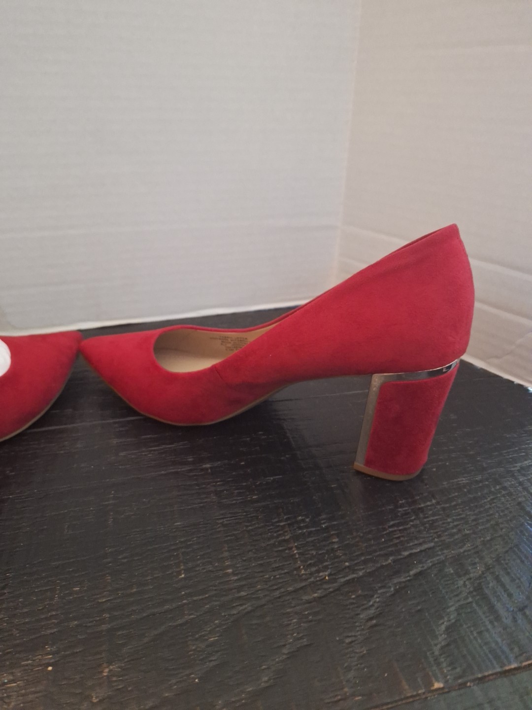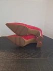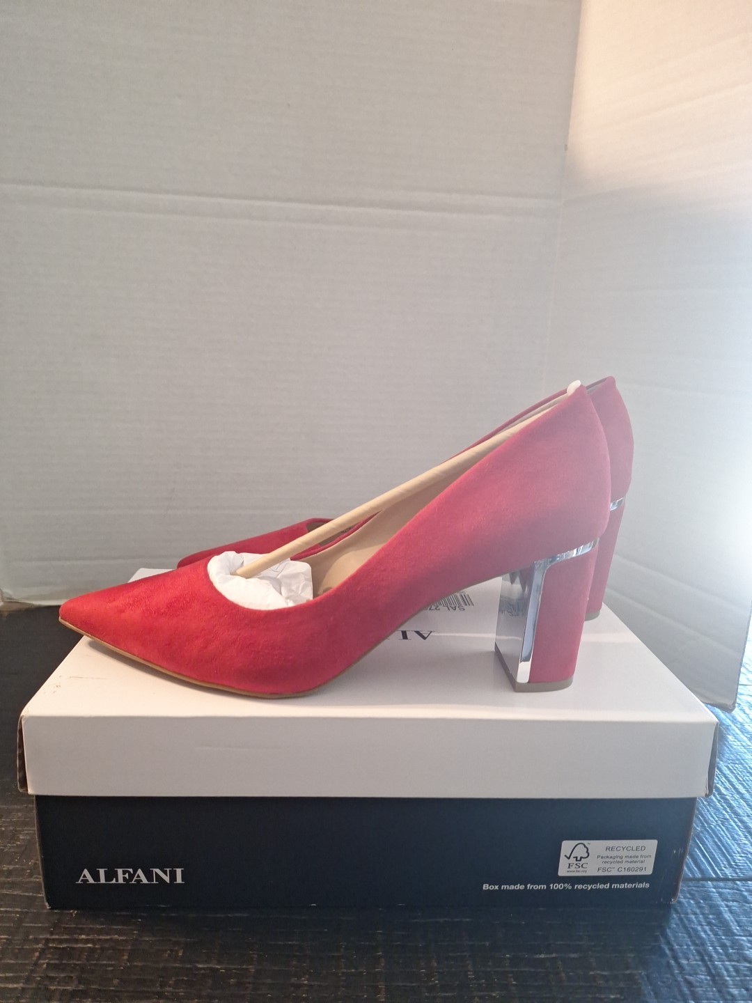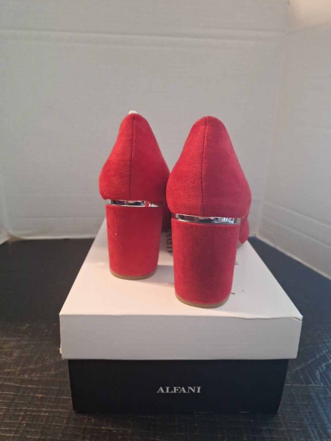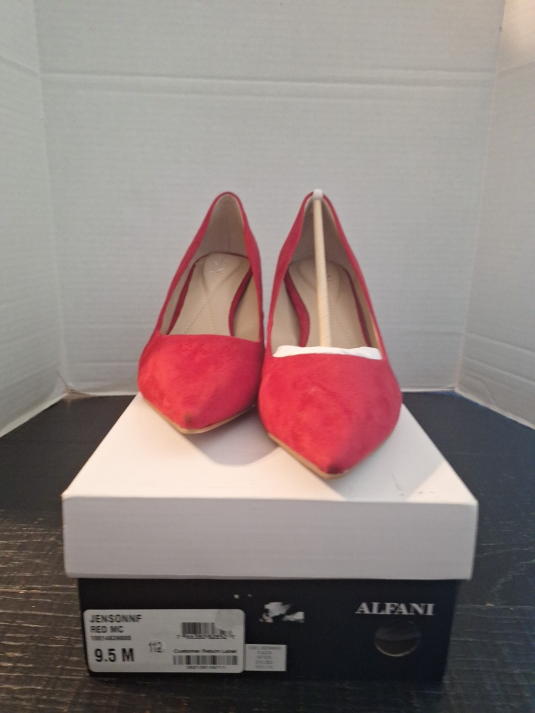 pre owned see pics never worn off carpet The Alfani Red Pointed Toe Stiletto Leather Pump Shoes in size 9.5M are a stylish and elegant choice for women. Made with suede leather and featuring a pointed toe and stiletto heel, these shoes are perfect for adding a pop of color to any outfit. The brand, Alfani, is known for its quality and design, making these shoes a versatile option for various occasions. Whether worn for a night out or a special event, these shoes are sure to make a statement.