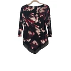ALFANI 3/4 SLEEVE SCARF HEM BLACK ABSTRACT PRINT BLOUSE TOP SIZE SMALL A lively abstract print graces this beautiful blouse by Alfani. Perfect to wear with leggings or skinny jeans! Rounded Neckline. 3/4 length sleeves. Pointed scarf style hem. Polyester & Soandex blend. Size Small. Bust 20.5 inches. Length 30 1/4 inches. Approximate measurements taken flat. Excellent Preowned Condition! Like new! Offers welcome! colorful casual career lightweight feminine girly printed 163T