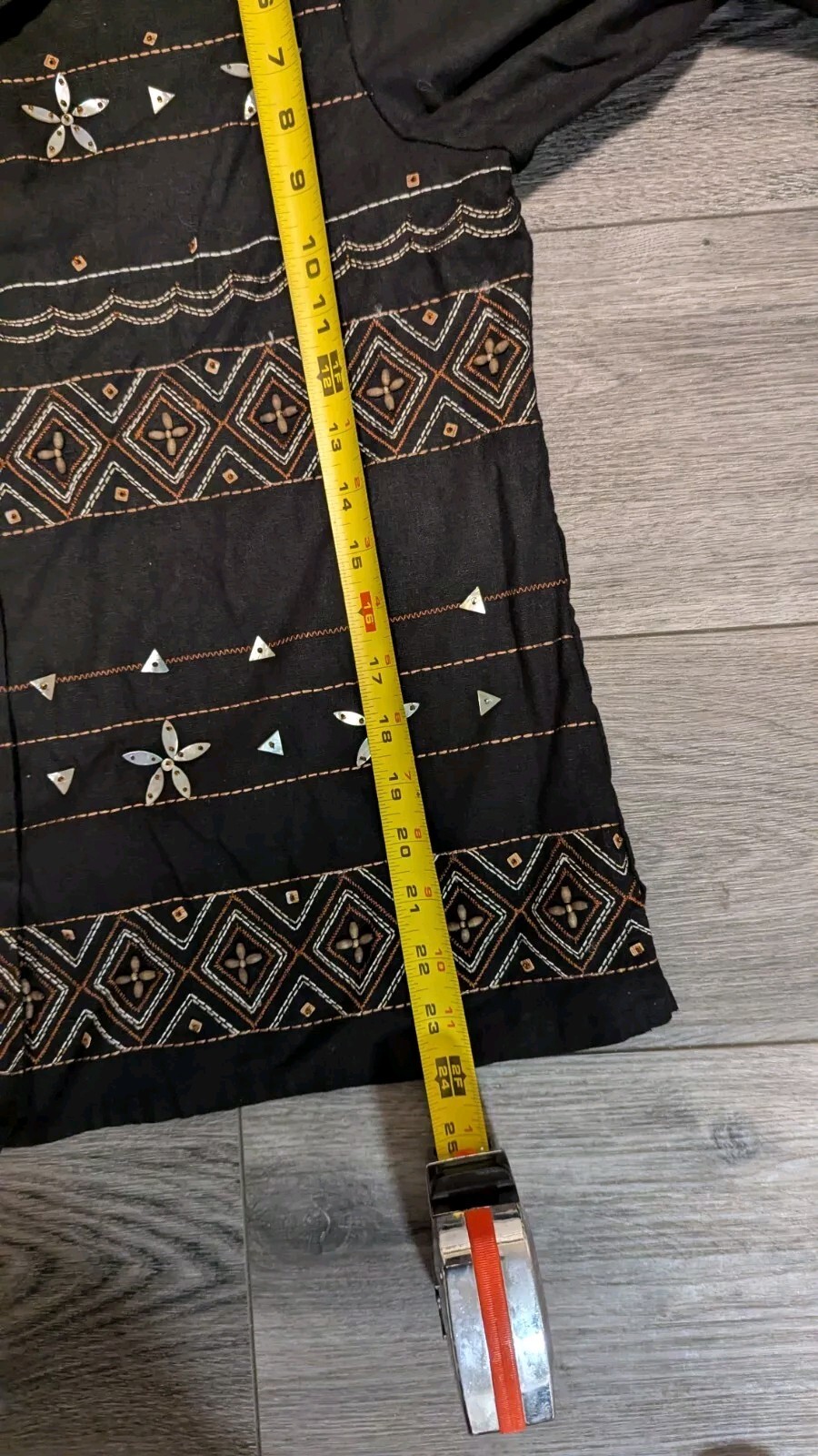 This vibrant Alfred Dunner shirt is a standout piece with its eye-catching geometric pattern and beaded details, giving off a cool retro-Western vibe. The linen blend keeps it breezy yet stylish, perfect for layering in any season. The 3/4 sleeves and unlined design make it versatile for casual outings or dressed-up occasions. Love the tribal-inspired accents—it adds just the right amount of boho flair. A fun, unique addition to any wardrobe!