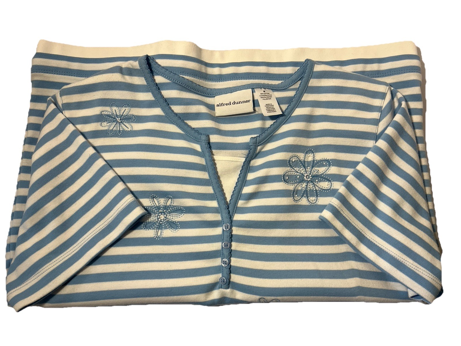 Elevate your wardrobe with this stunning Alfred Dunner women's blouse. The blue and white striped pattern is adorned with floral embroidery and studded accents, creating a unique and eye-catching design. The rounded v-neckline and short sleeves make this blouse perfect for any occasion, whether it be travel, casual, workwear, or business. Crafted with a regular fit and pullover closure, this blouse is both comfortable and stylish. The blouse is made of high-quality materials and is perfect for any season, whether it be winter, summer, fall, or spring. Don't miss out on this must-have addition to your wardrobe! Shoulder pads easily removable. Chest measures 21 inches pit to pit with a length of 25 inches.