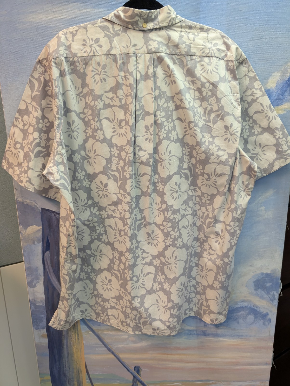 The Alfred Shakeen by Reyn Spooner 2XL Reverse Printed Popover Hawaiian Shirt is a stylish and comfortable option for men looking for a casual button-down shirt. This shirt features a floral pattern in gray and white, short sleeves, a collared neckline, and a pullover closure. Made of lightweight and breathable cotton, it is perfect for travel, parties, or casual occasions during the summer, fall, and spring seasons. The Hawaiian theme adds a fun and unique touch to this shirt, making it a standout piece in any man's wardrobe.