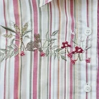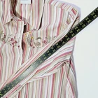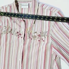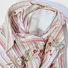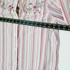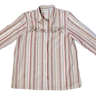 65% polyester 35% cotton button down long sleeve shirt with embroidered mushrooms bunny snail flowers and some beading very beatufull looking long sleeve shirt.There is shoulder pads that can easily be snipped out shirt is in very good clean condition no holes or tears. SZ 8 measures flat 16" across shoulders 21" pit to pit 28" length 20" sleeves