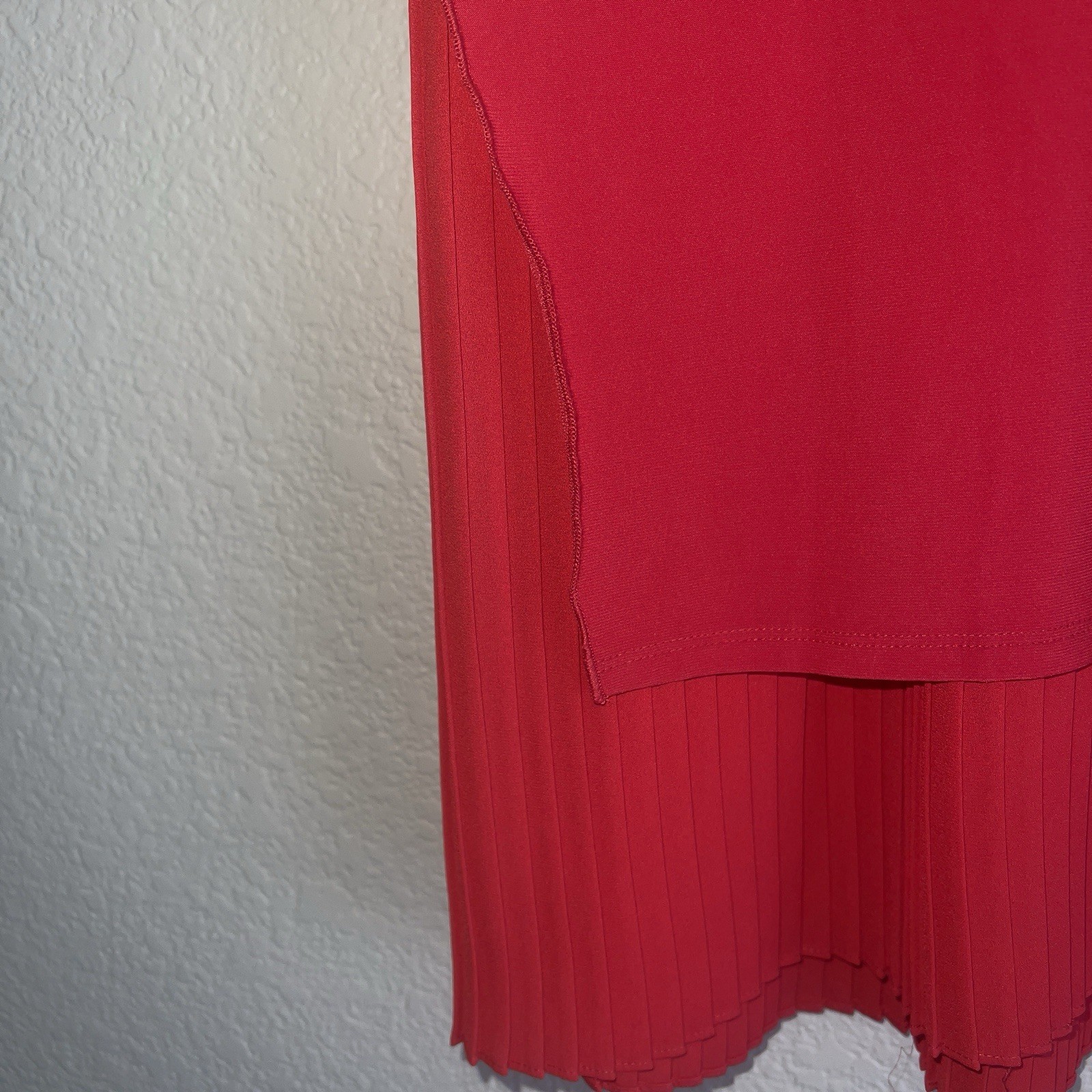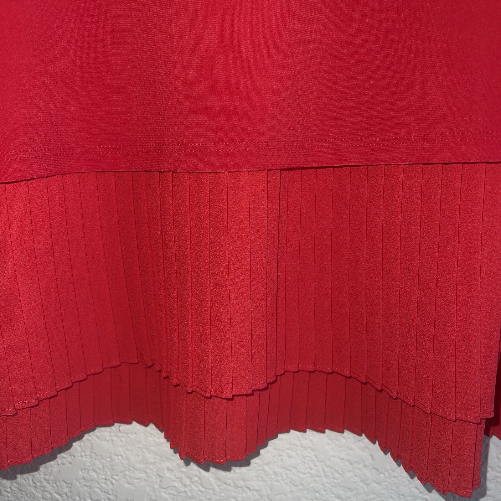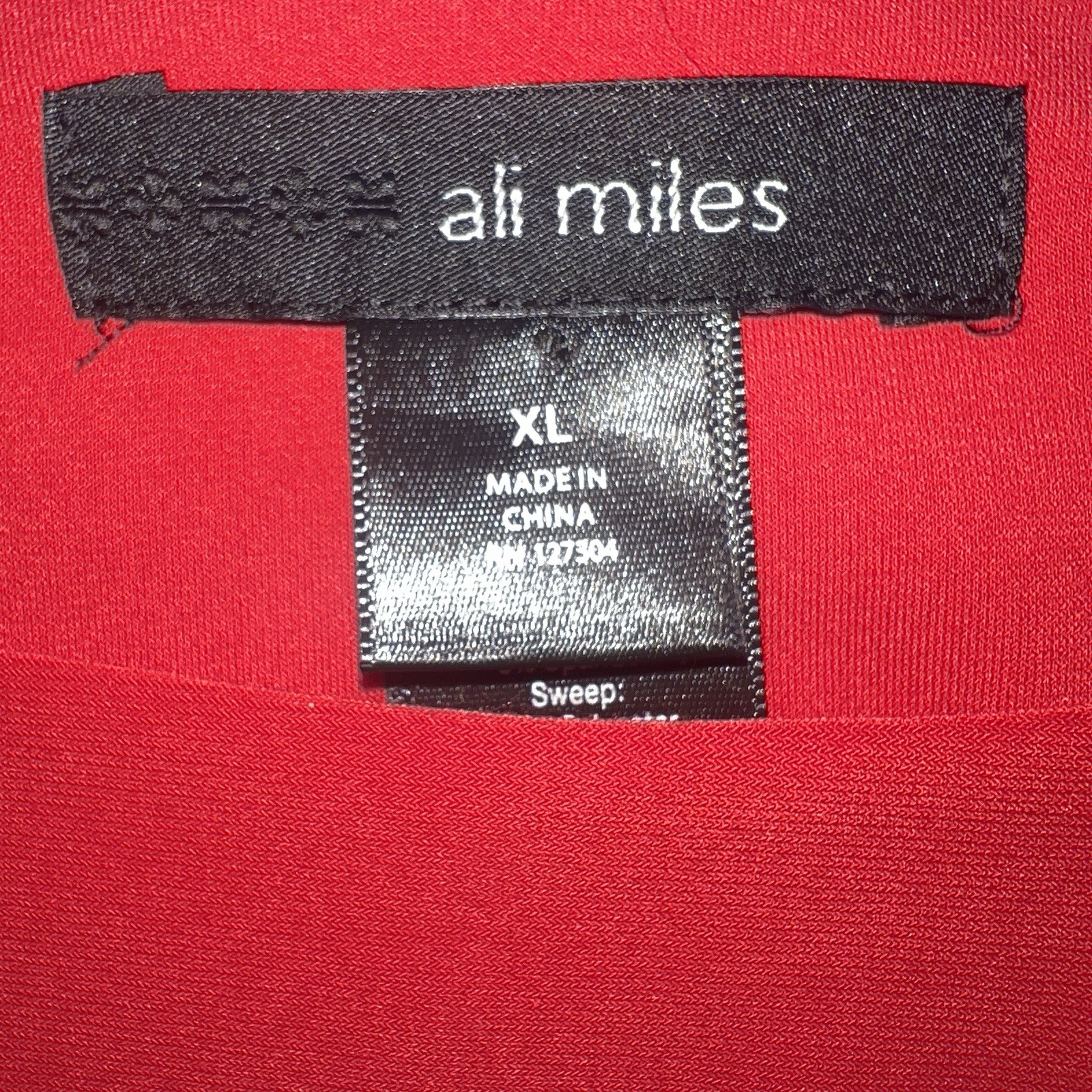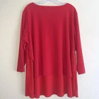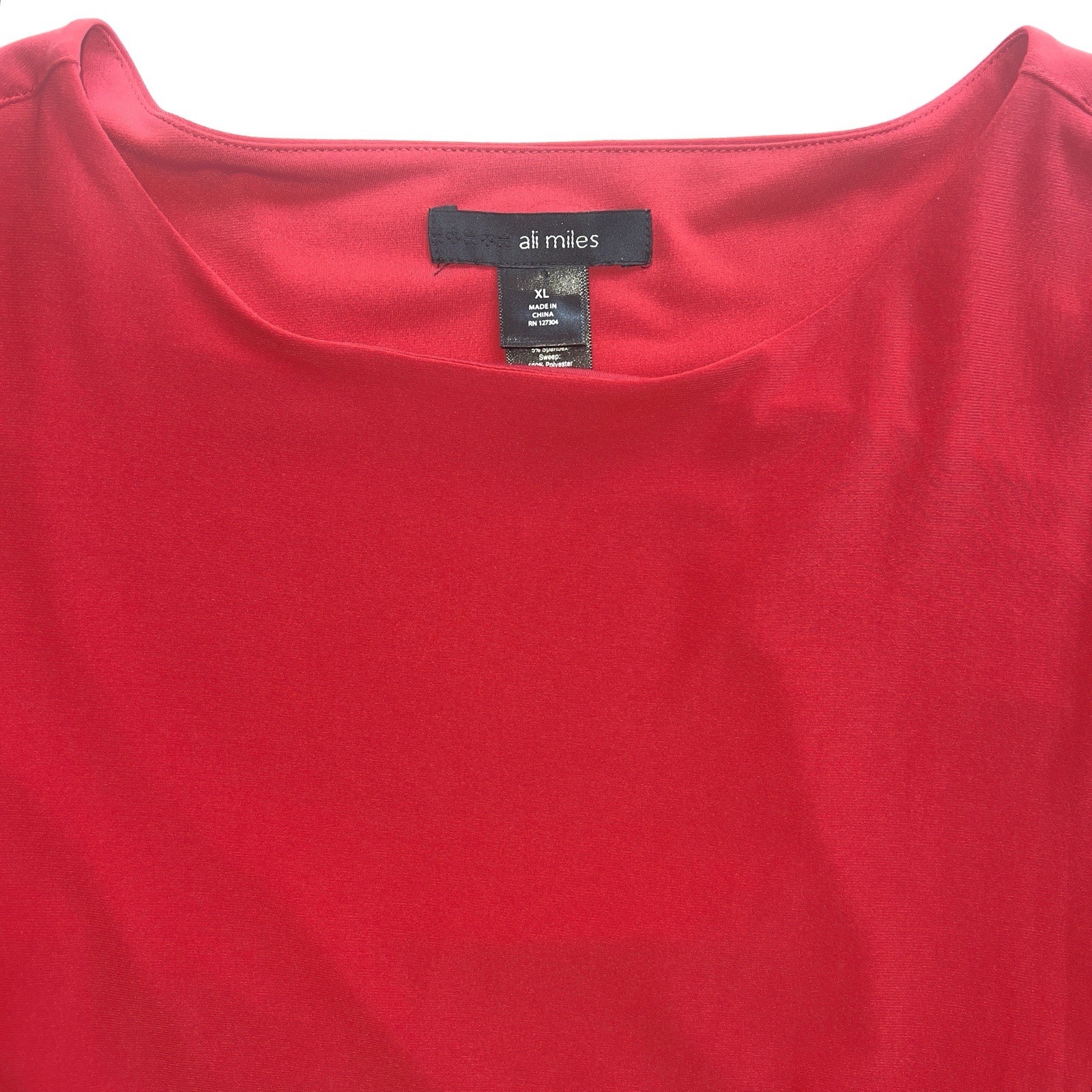 This vibrant red tunic from Ali Miles features a relaxed, boxy fit with 3/4 length sleeves, offering a comfortable and stylish look. The soft, stretchy knit material and scoop neckline enhance its casual elegance, making it a versatile addition to your wardrobe. Scoop neckline 3/4 sleeves Pleated hemline Layered 95% Polyester, 5% Spandex Sweep: 100% Polyester Size: XL Length 29 1/2”, Pit to Pit 24” Color: Red Item 1048