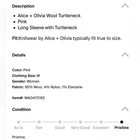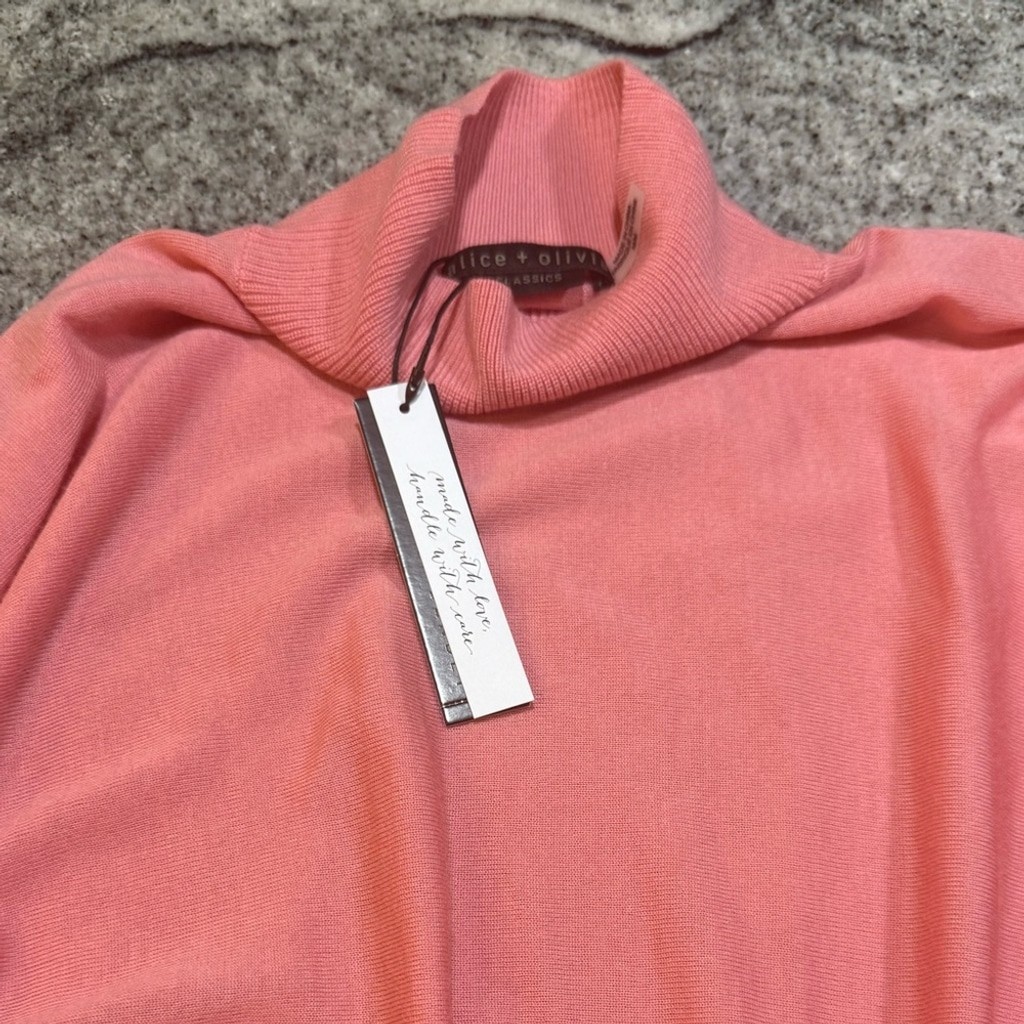 Elegant turtleneck sweater by Alice + Olivia. Soft pink hue. Perfect for layering. Thin wool sweater NWT Color is Rose Fabric is very stretchy Measurements Flat P2P 17-23” Waist 14-20”