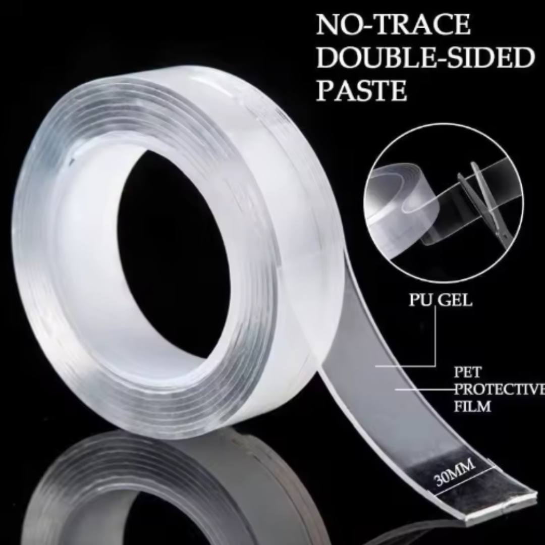 1/3/5M Double-Sided Nano Tape | Transparent Traceless Waterproof Reusable Adhesive Gel Tape Product Description: Upgrade your home, kitchen, and workspace with this high-quality Double-Sided Nano Tape , designed for strong adhesion without damaging surfaces. Made from Nano PU Gel , this tape is transparent, waterproof, washable, and reusable , offering a long-lasting and versatile solution for everyday needs. Ideal for kitchens, bathrooms, walls, carpets, desks, and more — this traceless nano tape keeps your items firmly in place and removes cleanly without leaving residue. Perfect for hanging small items, fixing objects, or organizing spaces. Key Features: • Strong Double-Sided Adhesive Built with powerful nano gel that grips securely on most surfaces including glass, metal, tile, wood, and plastic. • Washable & Reusable Simply rinse with water, let it dry, and reuse it up to 600+ times . • Traceless Removal Removes cleanly without damaging walls or surfaces — no sticky residue or peeling paint. • Waterproof Performance Perfect for kitchens and bathrooms where moisture is common. • Multi-Functional Use Great for carpets, kitchen tools, bathroom accessories, small decorations, car interiors, and more. • High Transparency & Flexibility Clear design blends with any décor and stretches without breaking easily. • No Tools Needed Can replace nails, screws, and rivets for simple mechanical fixing. Product Specifications: Item Name: Transparent Nano Tape Material: Nano PU Gel Tape Type: Double-Sided Filament Tape Features: Washable, Reusable, Removable, Traceless, Universal Lengths Available: 1m 3m 5m Width: 3 cm Thickness: 0.1 cm Model Number: A1TAW3005 Origin: Mainland China Package Includes: 1 × Double-Sided Traceless Nano Tape Notes: Slight size or color variations may occur due to monitor settings or manual measurement. Make sure surface is clean and dry for best adhesion.