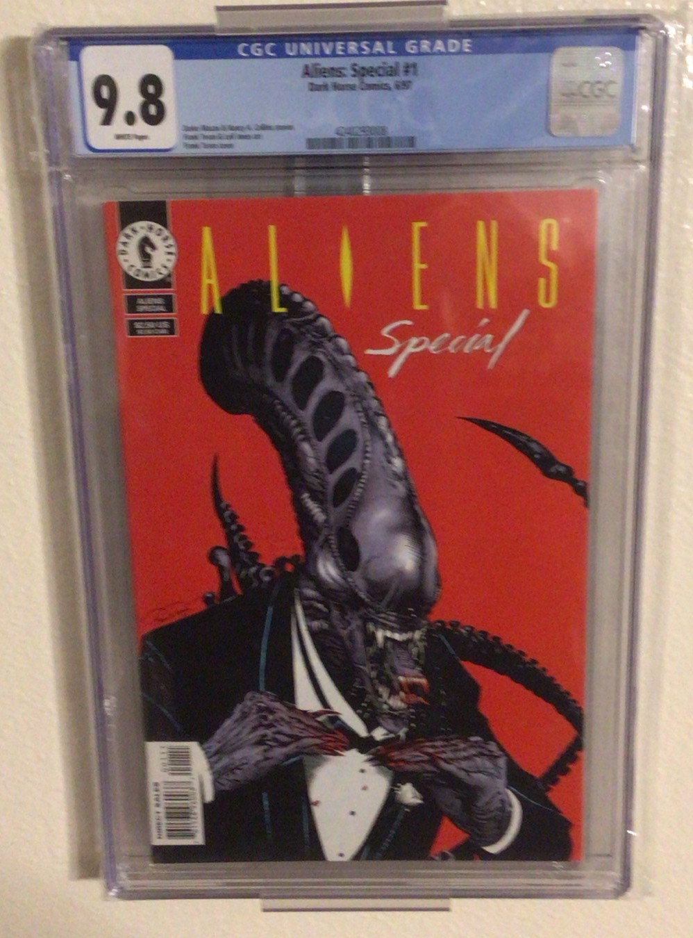 The product is a highly sought-after comic book, Aliens Special #1, with a CGC 9.8 grade - one of only 9 copies in this grade exist! This single issue, featuring the Xenomorph from the Alien universe, is part of the US Comics tradition and falls under the Horror & Sci-Fi genre. Published by Dark Horse Comics, the artwork by Frank Teran make it a valuable addition to any comic book collection, especially for fans of the Alien series.