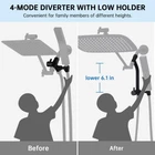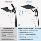 ALL METAL AND LARGE RAINFALL SHOWERHEAD: This dual shower head is made of high quality all-metal material to ensure durability. The 14-inch rectangular rainfall showerhead has a wide coverage area that can easily cover your entire body, allowing you to enjoy a gentle, refreshing rainfall sensation every time you shower, taking your showering experience to a whole new level! INNOVATIVE AND CONVENIENT DIVERTER: 4 water output modes including a convenient pause function to suit your needs. The low handheld holder and splitter knob are easy to operate and suitable for family members of different heights. You can enjoy the luxury of both a rainfall shower and a handheld shower without worrying about overlapping water discharges 12-INCH ADJUSTABLE EXTENSION ARM: You can easily find the right height and angle for your needs, suitable for people who don't use height. After determining the height, the free rotating locking ring allows you to tighten the extension arm to the correct position 3-SETTING HANDHELD SHOWERHEAD WITH MASSAGE FUNCTION: The oscillating massage function allows you to relax while enjoying a soothing massage. Easy to use push switch to control the mode with just one hand. With the 65-inch long hose you can easily clean every part of your body and reach every corner of your bathroom EASY INSTALLATION: Everything you need for installation is included in the package. Follow the instruction and you can easily finish the installation without calling a plumber. If you have any questions, feel free to email us and we will get back to you within 24 hours!