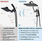 ALL METAL AND LARGE RAINFALL SHOWERHEAD: This dual shower head is made of high quality all-metal material to ensure durability. The 14-inch rectangular rainfall showerhead has a wide coverage area that can easily cover your entire body, allowing you to enjoy a gentle, refreshing rainfall sensation every time you shower, taking your showering experience to a whole new level INNOVATIVE AND CONVENIENT DIVIDER: 4 water output modes including a convenient pause function to suit your needs. The low handheld holder and splitter knob are easy to operate and suitable for family members of different heights. You can enjoy the luxury of both a rainfall shower and a handheld shower without worrying about overlapping water discharges 13-INCH GOOSENECK ADJUSTABLE EXTENSION ARM: You can easily find the right height and angle for your needs, suitable for people of different heights. After determining the height, the free rotating locking ring allows you to tighten the extension arm to the correct position 3-SETTING HANDHELD SHOWERHEAD WITH MASSAGE FUNCTION: The oscillating massage function allows you to relax while enjoying a soothing massage. Easy to use push switch to control the mode with just one hand. With the 65-inch long hose you can easily clean every part of your body and reach every corner of your bathroom EASY INSTALLATION: Everything you need for installation is included in the package. Follow the instruction and you can easily finish the installation without calling a plumber. If you have any questions, feel free to email us and we will get back to you within 24 hours