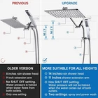 All Metal Rain Shower Head with Handheld Built-in Power Wash Mode, 3-way Diverter with Pause Setting, 11 Inches Adjustable Extension Arm, Long Hose Chrome, 14 Inches 【All-metal 14-inch rain shower】Made entirely of stainless steel for durability in wet conditions, this rain shower boasts pressurized nozzles that cover your entire body for a truly enjoyable bathing experience 【Two modes of metal handheld】With durable metal construction and practical wash and spray settings, our handheld achieves a perfect balance of durability and functionality. The side switch allows you to switch between modes with just one hand 【Unique splitter design】Featuring a 11-inch extension arm and downward extension of the handheld bracket and switch, our unique splitter design makes it easy for people of different heights to adjust the switch and take out the handheld without having to raise their arms 【Four functions of the switch】Our clearly visible face-to-face switch design offers four functions to choose from: separate rain shower mode, separate hand-held mode, simultaneous water out of the mode, and pause mode. Pause mode allows people to keep the same temperature and switch the water on and off through the manifold without having to readjust the temperature every time the switch is made 【EASY INSTALLATION】Everything needed for installation is enclosed in the package. No need to call a plumber. If you have any questions about this item, please feel free to contact me. We will get back to you as soon as possible The video showcases the product in video guides you through product video compares multiple video shows the product being unpacked.