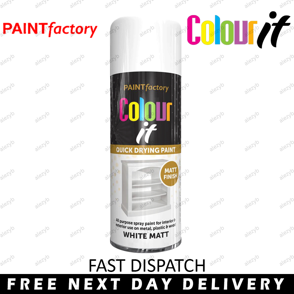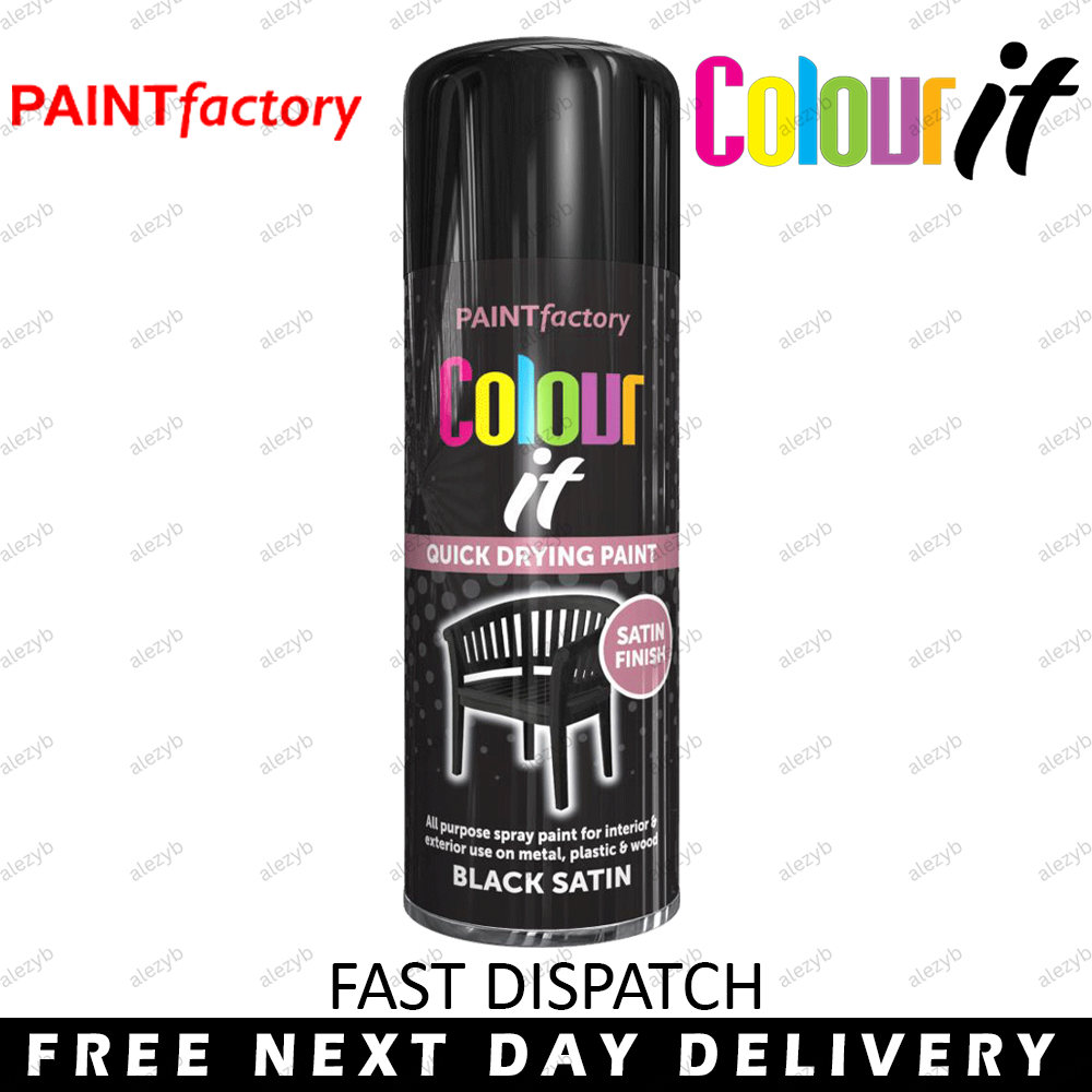 All Purpose Spray Paint Aerosol Matt Gloss Satin Metal Wood Plastic 400ml Description · Quick Drying Effective Spray Paint · No Harmful to the Environment CFCs. · Capacity: 400 ml · Suitable for Interior & Exterior Usage · Easy to Use on: Metal, Plastic & Wood · Bright colour with a smooth coat · Good results are easily achievable Colours: BLACK.MATT BLACK.GLOSS BLACK.SATIN WHITE MATT WHITE GLOSS WHITE SATIN WHITE PRIMER ANTIQUE WHITE CHROME GREY PRIMER PLASTIC PRIMER LIGHT GREY CHERRY RED CRIMSON RED RED-PRIMER PROPER PURPLE VERY VIOLET PERFECT PINK BUBBLEGUM PINK SKY BLUE BEAUTIFUL BLUE GRASS GREEN FOREST GREEN LIME GREEN NATTO GREEN COTTAGE CREAM IVORY SILK SUNSHINE YELLOW ESPRESS BROWN ORIGINAL ORANGE