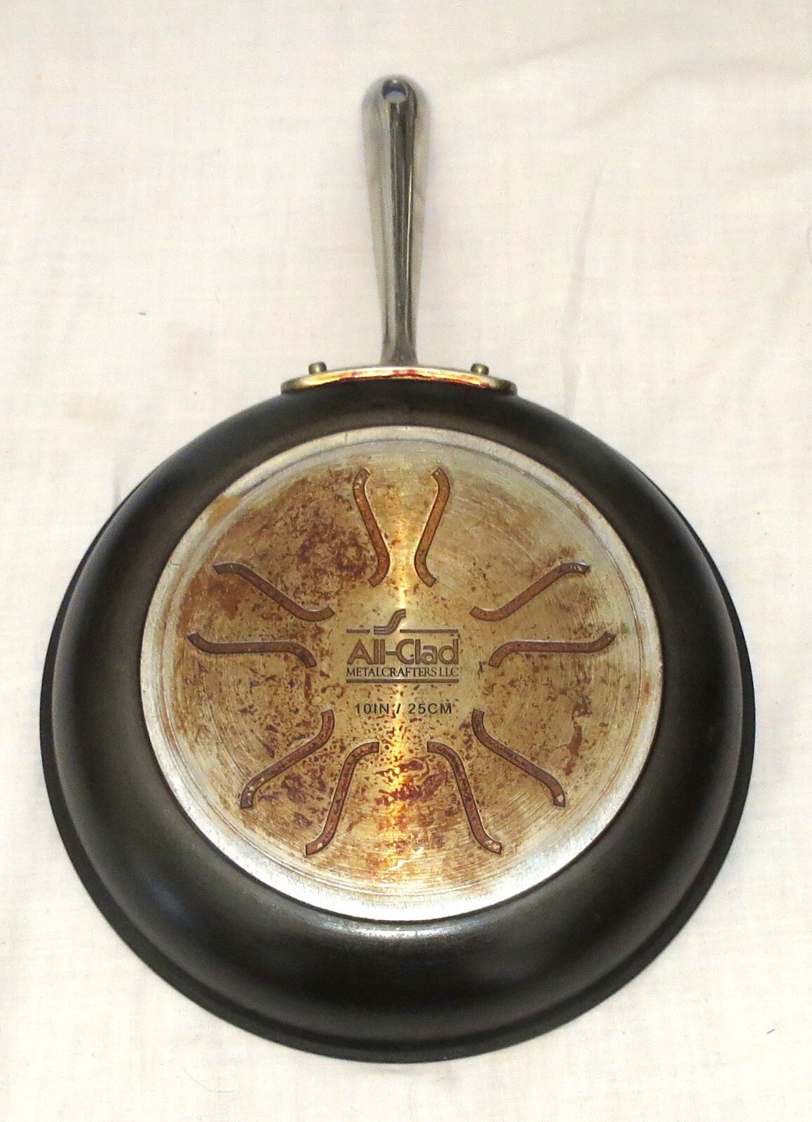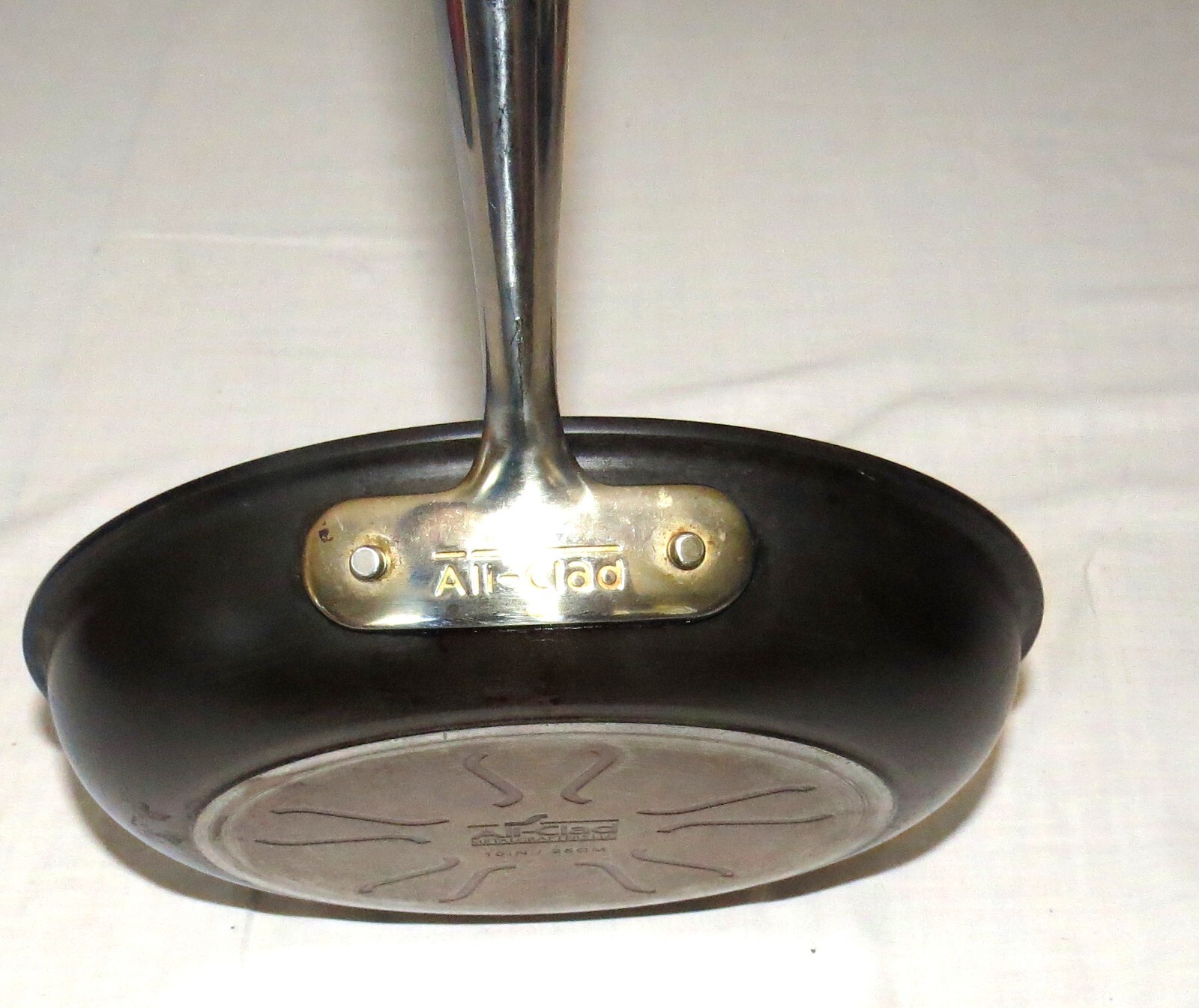 All-Clad Metalcrafters 10 inch Non-stick Skillet Fry Frying Pan -------------------------------------------------------------------- We try to declare all issues. Any white spots in the pictures that have not been mentioned are more than likely glare from the camera flash, but if you have any doubts, please don't hesitate to ask. Please look at our other auctions, and especially our ebay store items, and save on shipping with multiple wins Please email us with any questions. Honest Shipping : We do not insult your intelligence by hiding the shipping costs in the price of our items, and then offering "free" shipping - trying to fool you into thinking that we are absorbing the shipping costs. What nonsense! Our shipping costs are based on an estimate of the shipper's rates, ebay shipping fees, plus a small handling charge. If you can find the same item with a cheaper total cost - purchase price plus shipping - anywhere on the web - please contact us. We cannot guarantee to beat it (because of distance-based shipping), but will give it our best shot. Please be sure that you understand, and are comfortable with, the total costs before making your purchase. If you have any questions - please ask first. Combined Shipping: We always offer combined shipping for multiple purchases. Please add your purchases to your ebay "cart". When you have completed your purchases, (either multiple items from a single listing, or items from two or more listings), please contact us, using the "Requests total from seller" button, and we will generate a final combined-shipping invoice.. Note: You will possibly receive an earlier invoice (or invoices) generated automatically by ebay. These are accurate for single item purchases, but often inaccurate for multiple items, due to limitations with ebay's shipping calculator. Our combined shipping invoice will include a note stating that it reflects combined shipping. If you have any doubts - just ask. Shipping Methods: Unless otherwise noted, for each item we offer three forms of shipping: 1. personal pick-up: You can meet us in San Jose, CA - with zero shipping charges. 2. One of: expedited USPS First Class Mail if the package qualifies, or economy USPS Media Mail if the package qualifies, or economy USPS Parcel Post. 3. expedited USPS Priority Express Mail We are always willing to at least consider any other valid shipping method - just ask. If the costs allow it, we will promote your package to a faster service where we can, at no additional charge to you. If shipping is not to a USA contiguous 48 state street address, or you request a faster or other shipping method, such as UPS Air, or Express Mail, then shipping costs may vary. Please allow at least 14 business days for delivery to the contiguous 48 USA states. Media Mail typically takes longer. More specific estimates are available on the USPS web site. For AK and HI , USPS Priority Mail should take 4 days or fewer, but USPS offers no time estimates for Parcel Post. Books, other printed matter, and media: We typically ship books, CDs, videos, and the like by Media Mail. This can be considerably slower than other services. If you need your book quickly, please let us know, and we will re-quote the shipping, typically at a higher cost. International Buyers - Please note: International mail is often slower than the estimates available on the USPS web site, so customers should allow a minimum of 14 days for airmail delivery - longer if your parcel is held in incoming customs. USPS no longer offers any international surface mail, or M-bag service. Air Mail is the only remaining option for international shipments. International buyers should double-check for mailing costs before bidding. Also: Import duties, taxes and charges are not included in the item price or shipping charges. These charges are the buyer's responsibility, so please check with your country's customs office to determine what these additional costs will be prior to bidding/buying. Additional charges are sometimes collected by the delivering freight (shipping) company on delivery or pick-up - do not confuse them with additional shipping charges. We do not mark merchandise with lower values, or mark items as "gifts" - US and International government regulations prohibit such behaviour. Questions. Please email us with any questions: If you have any questions, please ask at least 24 hours before end of auction as we have other commitments that require our attention, and are not always at the computer. We pack with care but after your parcel is delivered to the carrier we have no control over delivery times. Please ask all questions before bidding. Returns. Unless otherwise noted, we always accept returns - for any reason. The item must be returned within 30 days with all original packaging . The purchase price will be refunded when the item is returned in the same condition as it was shipped . If there is a relevant error in the listing description, we will also refund shipping in both directions. Problems & Issues. Please always contact us with any problems before leaving any feedback or DSRs. We will always do everything we can to resolve any issue. Once feedback has been left it cannot be changed, and we cannot guarantee to resolve your problems. Feedback: **We always work to earn 5-star feedback from you. If you have any concerns about this transaction, please contact us, preferably before bidding, but definitely before leaving feedback, so that we can do everything possible to resolve the issue.** If the transaction has gone well Positive feedback and 5-star DSRs - for each item, if you have bought more than one - is appreciated. Payment Method: For shipped purchases, all major credit card payments through Paypal. We cannot accept credit card payments directly. Payment Timing: Unless negotiated before the purchase is made, payment must be received within seven days of the listing's close. All non-paying bidders will be reported to Ebay. Wherever poss