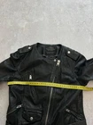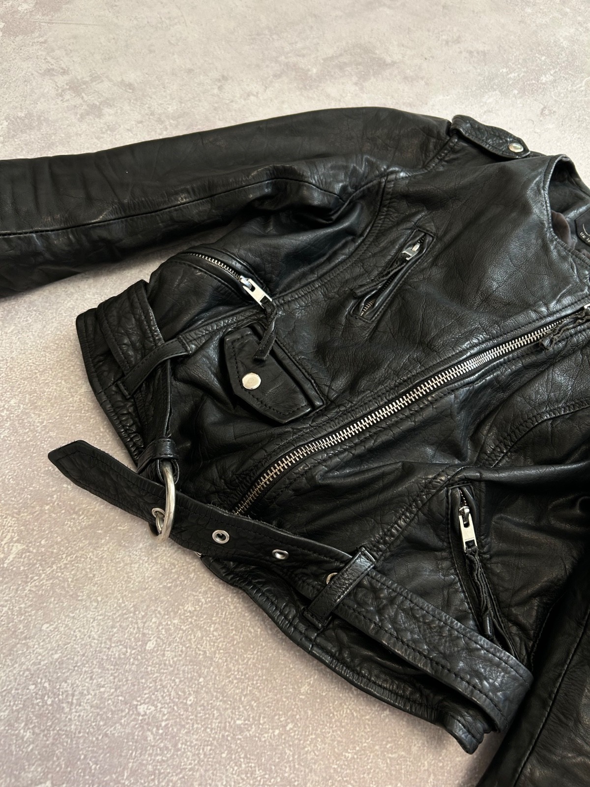 The AllSaints Women's Black Leather Biker Jacket in UK size 10 (US 6, EU 38) is a stylish and edgy cropped jacket designed for women. Made from high-quality leather, this jacket features a solid black color with long sleeves and a zip and buckle closure. The biker style adds a touch of attitude, making it a versatile piece for various occasions, from casual outings to parties. With a regular fit and belted design, this jacket is both fashionable and functional, perfect for the winter, fall, and spring seasons. Made in Mauritius, it exudes a designer vibe with a hint of motorcycle-inspired flair.