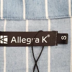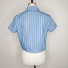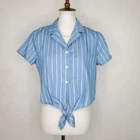 Allegra K. Blue White Pinstripe Button Up Tie Front Short Sleeve Top NWOT Size S Spring summer lightweight blouse Vacation Cotton polyester blend Casual Minor stretch Spare Button NWOT - New Without Tag Pictured on woman's Small dress form Notice: Color may differ from your computer, phone or device display Buttoned relaxed flat lay measurements are approximate, fit not guaranteed. Pit to pit: 19 1/2" Front Length shoulder to hem: 19" Back Length down center: 18" Sleeve: 6 1/2" Width at 3rd Button front side to side: 20" E605B M30122 9106 **4.4oz 70624 EBMP1 blue white striped stripe stripes pinstripe summer sprint tie front top blouse
