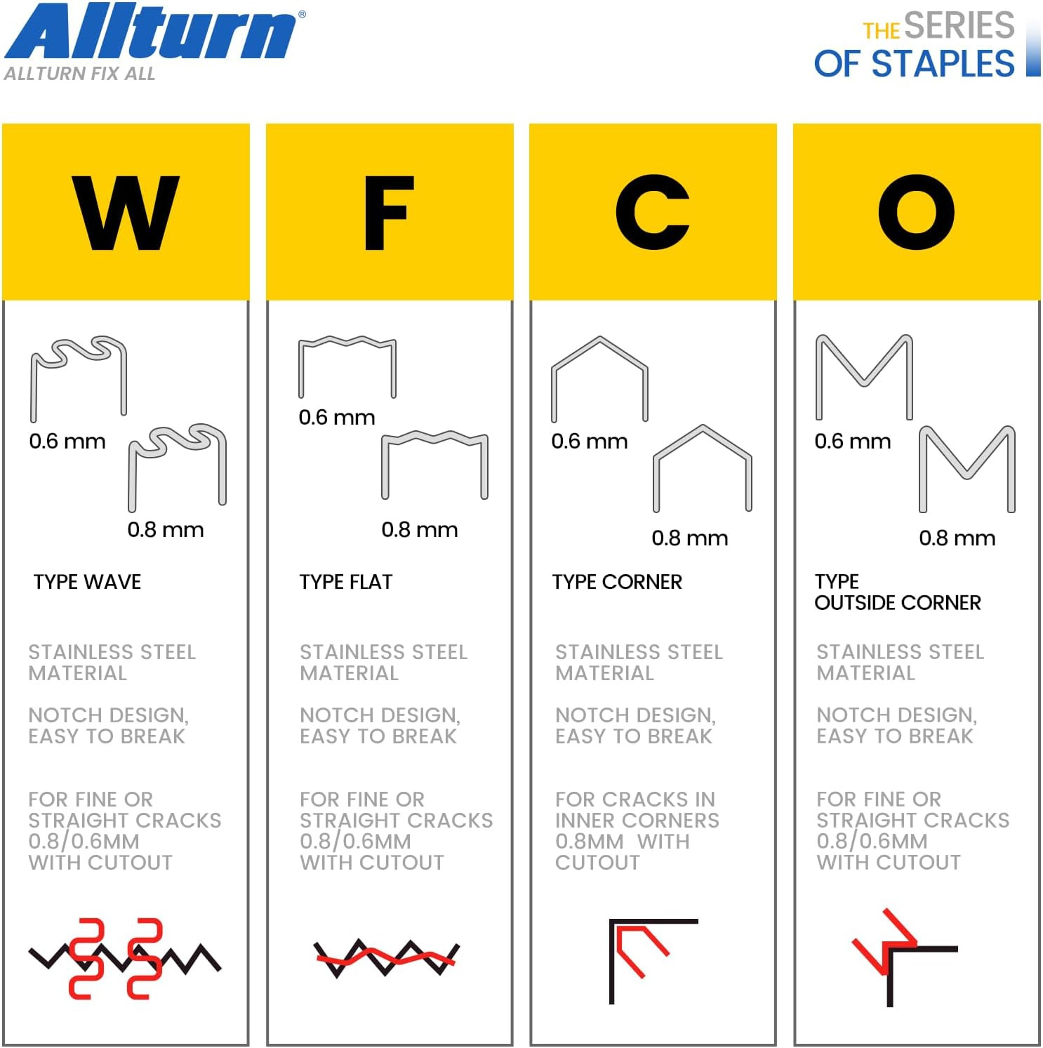 Allturn 1200 Plastic Welder Staples,Plastic Welding Staples,6 Types Silver Product Details Manufacturer: Allturn Part Number: Hot Stapler-1 Item Weight: 10.8 ounces Product Dimensions: 0.59 x 0.65 x 0.04 inches Item model number: Hot Stapler-1 Color: Silver Style: 6 types of 1200PK Material: Stainless Steel Power Source: Physical Force Item Package Quantity: 1 Number Of Pieces: 1200 Capacity Description: Full Strip Batteries Included?: No Batteries Required?: No Brand: Allturn Product Dimensions: 0.59"L x 0.65"W Item Weight: 0.31 Kilograms Color: Silver Number of Pieces: 1200 Package Includes 1200pcs Staples:200 X 0.6mm flat staples, 200 X 0.8mm flat staples, 200 X 0.6mm wave staples, 200 X 0.8mm wave staples, 200 X 0.6mm outside corner staples, 200 X 0.8mm inside corner staples,1 X transparent packing box. Quality Material:this automotive repair staplers use stainless steel as material, which features with advantages of high hardness, anti-oxidation and anti-corrosion to provide you with long-term service; With low melting point, nice fluidity, hardness, toughness and sealing, they are the first choice for repairing holes and stitching up long cracks. Simple to Operate:the automotive welding repair stapler is pre-cut and easy to remove the tail piece, saving cutting and grinding time; Besides, it is a practical tool that can provide you with an nice experience OWide Practicality:the car auto bumper hot stapler can be easily welded without any flux, and suitable for using with hot stapler to repair most plastic materials, such as ABS, PVC, nylon etc.