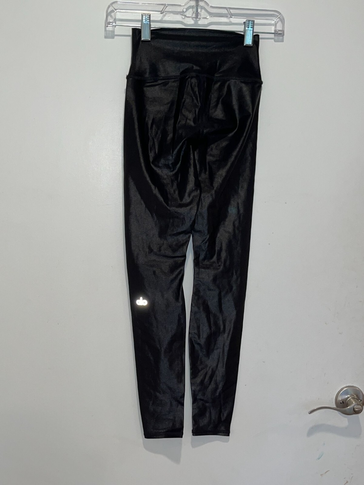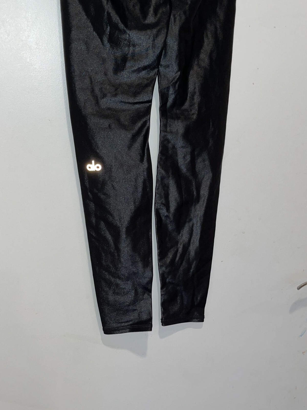 Alo Yoga Black High-Waist Airbrush Athletic Leggings Women XS Black Glossy Shiny black leggings with a high-waist design for a sleek look. Comfortable fit with stretch for versatile movement during workouts or casual wear. • High-waist for support • Stretchy material for flexibility • Sleek shiny finish • Reflective Alo logo detail • Ankle-length design size xs Great preloved conditions, no flaws