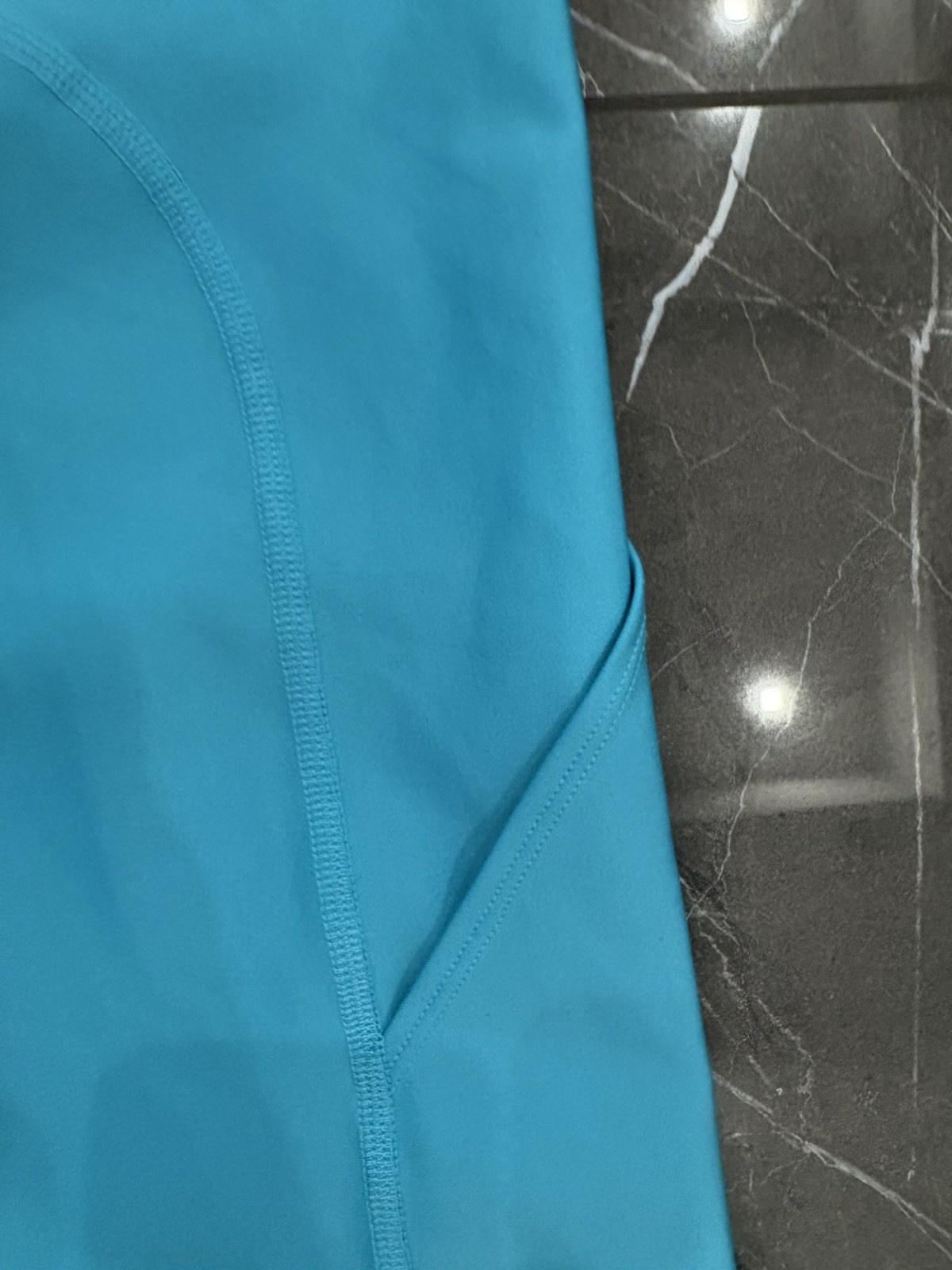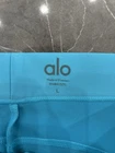 Waist is 28 laid flat with stretch and inseam is 28 The Alo Women's High Waist 4 Pocket Utility Legging in Large Aqua Blue is a stylish and functional piece of activewear. These leggings feature a high waist compression area and multiple pockets for convenience. The bright blue color adds a pop of color to your workout wardrobe, while the brand ALO ensures quality and durability. Perfect for various activewear occasions, these leggings offer both style and functionality for active women.