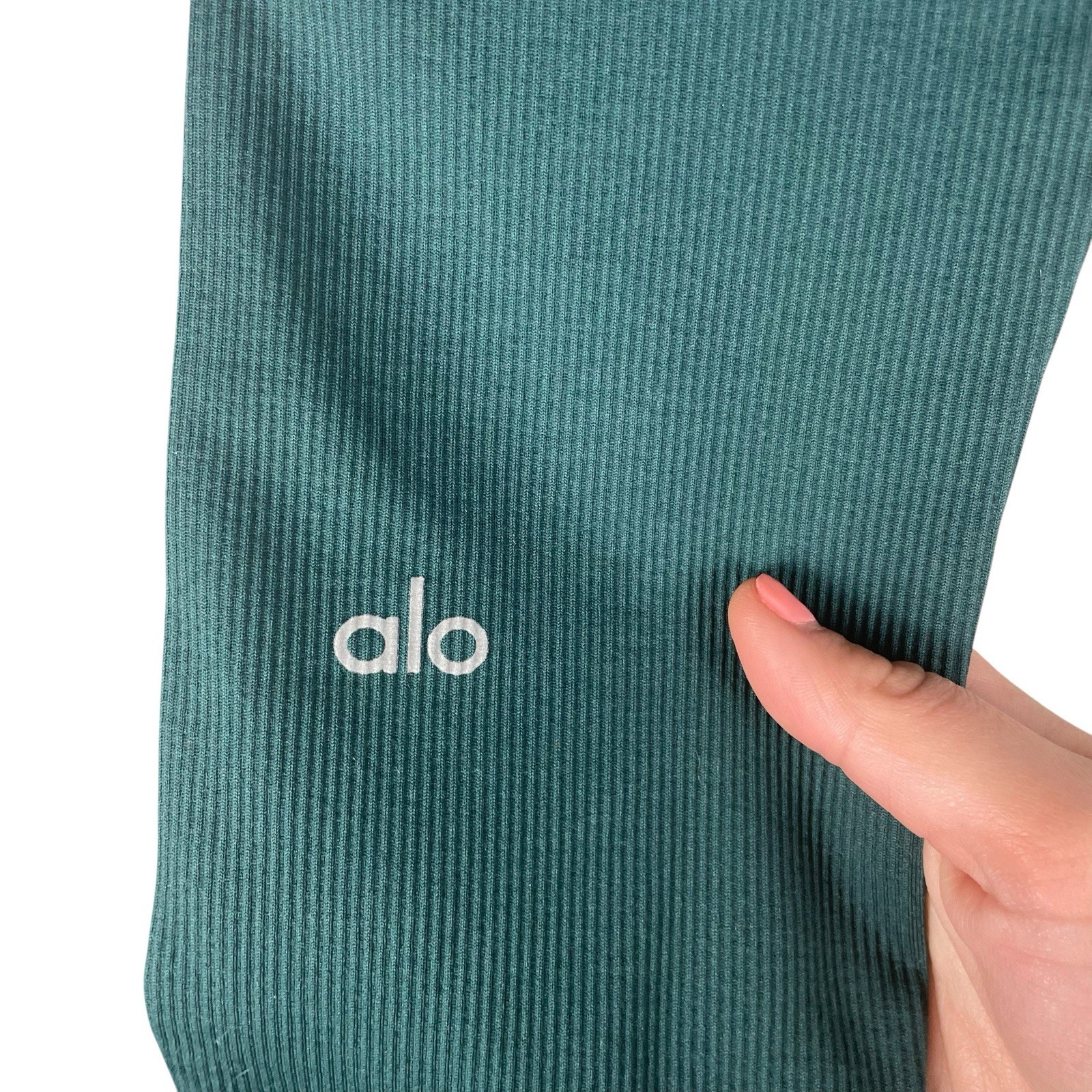 Move freely and confidently in these Alo Yoga ribbed leggings in a deep teal hue. Featuring a flattering high-rise fit and minimalist logo, these leggings are both stylish and functional. • Dark teal color with ribbed texture • High-waist design for support and comfort • “Mindful Movement” printed inside waistband • Signature Alo logo on lower leg • Size XS (approx. 13” waist, 35” length) • Stretchy and breathable fabric, perfect for yoga, Pilates, or lounging Trendy, durable, and versatile—your new go-to activewear essential. Hashtag Keywords: #AloYoga #MindfulMovement #RibbedLeggings #HighWaistLeggings #YogaWear #AloActivewear #TealLeggings #WomensAthleisure #LoungeToStudio #AloStyle