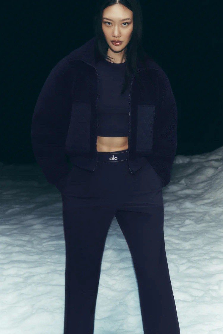 The Alo Yoga Navy Suit Up Trouser is a brand new small size pants perfect for activewear. Made of polyester blended fabric, these wide leg trousers feature a relaxed fit with a compression area at the waist. The solid blue color makes them versatile for summer, fall, and spring seasons, ideal for yoga and other active activities. Machine washable and without any personalization, these trousers from ALO are a stylish and comfortable choice for women looking for quality activewear.