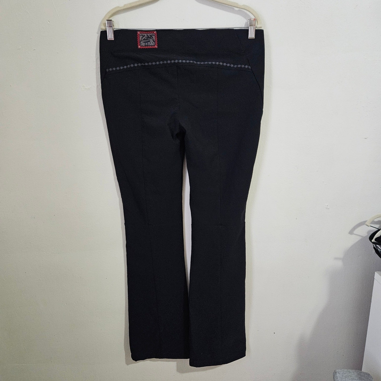 Keywords: Apres Ski, Y2K, Gorpcore, Retro Ski, Cabin Core, Athleisure, Alpine Style, Bootcut, Flare Leg, High-Performance, Embroidery, Designer Snow Gear, Technical Outerwear These stylish Alp-n-Rock black pants are in excellent condition with minimal signs of wear. They feature the brand's iconic embroidered logo patch on the back waist and beautiful decorative stitching, including the signature Edelweiss flower near the side Zip closure These pants have a slight flair/bootcut leg opening, a mid-rise fit, and belt loops. Color: Black Material: No content tag, but the fabric is smooth, stretchy, and appears to be a durable blend, likely suitable for active/outdoor wear like skiing, snowboarding, or hiking. Side Zip Closure Estimated Size & Measurements: There is no size or content tag present. The estimated size is a Small to Medium (S/M) based on the measurements provided below. Please compare these measurements to a garment you already own for the best fit. Fabric Measurement laying flat: Waist 16.5" Rise 8" Inseam 30" Boot opening 8.5" Excellent condition, gently worn Fast shipping!