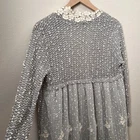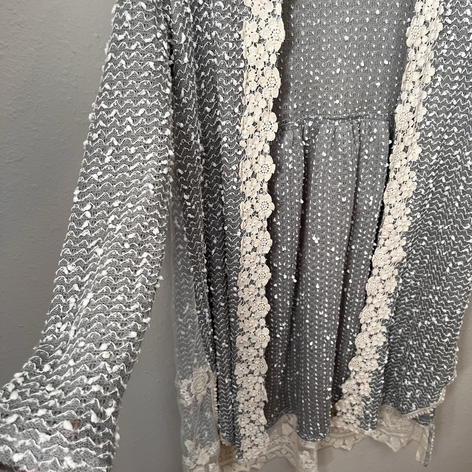 A'reve cardigan -Size: Medium -Long sleeve -Cream lace trim -Perfect for layering -Textured -Condition: has some small spot, see last photo. Otherwise in excellent pre-owned condition Measurements Pit to pit: 20 inches Length shoulder to hem: 40 inches