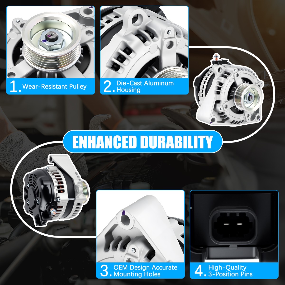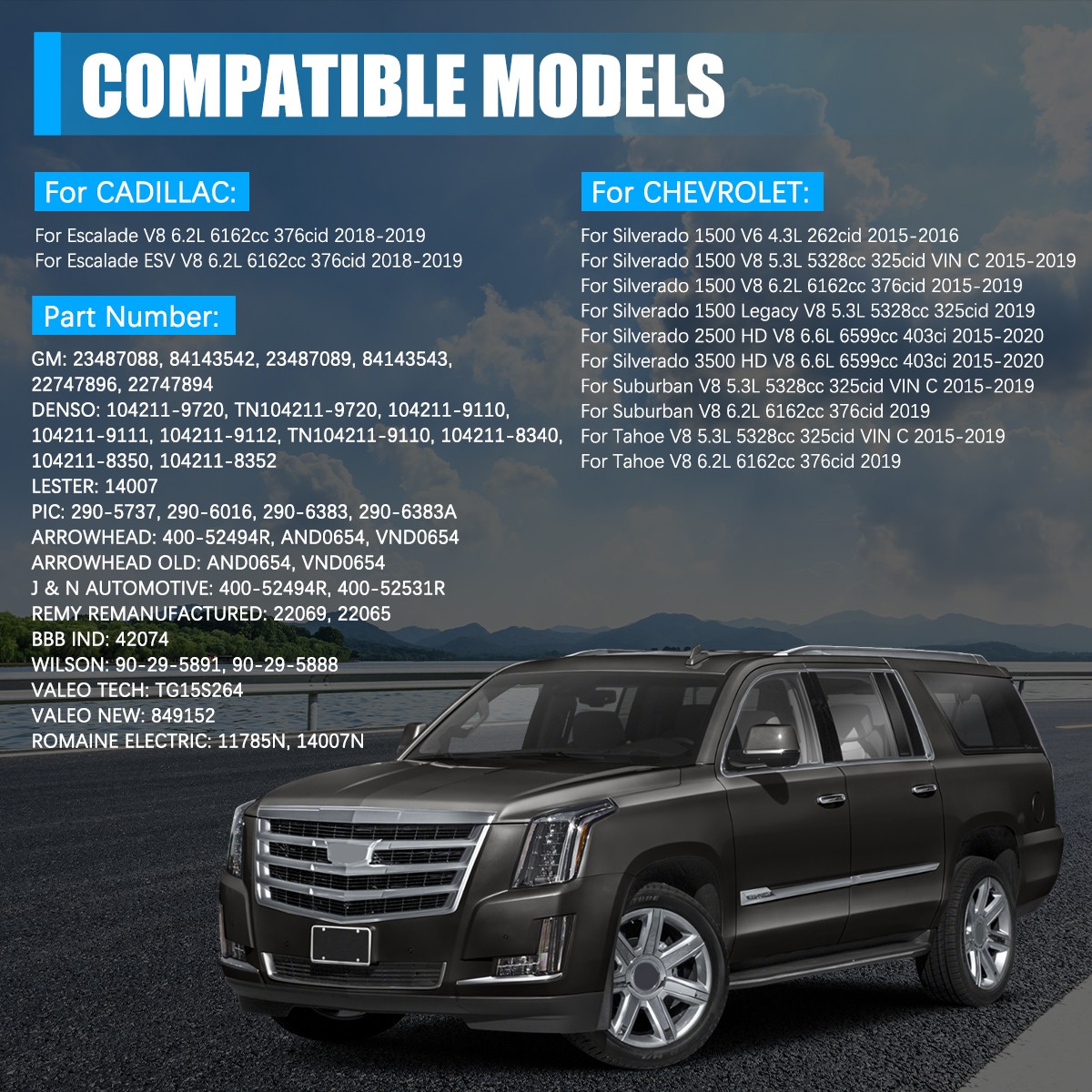 Product Description F eatures : Built to strict quality control standards 100% factory tested . Rugged and stable car alternator, matched against OE originals for performance. This alternators Key components are greased for noise, vibration, exposure and voltage stability to help with long term reliability and durability in harsh conditions . Longer life of the alternator through the use of premium brushes and other critical components that resist failure or poor performance . This automotive alternator provides high efficiency and reliability, ensuring stable power supply for your vehicle. It utilizes modern design and manufacturing technologies to deliver excellent performance and provide reliable power for various electrical equipment and charging systems. Specifications: Material:Aluminum Color:Silver Placement on Vehicle:Front Voltage:12V Rotation:CW Amperage :150 Pulley Groove Quantity :6 Regulator :IR Fan Type :IF Part Numbers : GM: 23487088, 84143542, 23487089, 84143543, 22747896, 22747894 Denso: 104211-9720, TN104211-9720, 104211-9110, 104211-9111, 104211-9112, TN104211-9110, 104211-8340, 104211-8350, 104211-8352 Lester: 14007 PIC: 290-5737, 290-6016, 290-6383, 290-6383A Arrowhead: 400-52494R, AND0654, VND0654 Arrowhead Old: AND0654, VND0654 J & N Automotive: 400-52494R, 400-52531R Remy Remanufactured: 22069, 22065 BBB Ind: 42074 Wilson: 90-29-5891, 90-29-5888 Valeo Tech: TG15S264 Valeo New: 849152 Romaine Electric: 11785N, 14007N Fitment : Cadillac Escalade 2018-2020 V8 6.2L Cadillac Escalade ESV 2018-2020 V8 6.2L Chevrolet Express 2500 2018-2021 V6 4.3L Chevrolet Express 2500 2017 V8 4.8L Chevrolet Express 2500 2017-2020 V8 6.0L Chevrolet Express 2500 2021-2022 V8 6.6L Chevrolet Express 3500 2018-2021 V6 4.3L Chevrolet Express 3500 2017 V8 4.8L Chevrolet Express 3500 2017-2020 V8 6.0L Chevrolet Express 3500 2021-2022 V8 6.6L Chevrolet Silverado 1500 2014 V6 4.3L Chevrolet Silverado 1500 2015 V6 4.3L Chevrolet Silverado 1500 2016 V6 4.3L Chevrolet Silverado 1500 2019 V8 5.3L Chevrolet Silverado 1500 2014-2015 V8 5.3L Chevrolet Silverado 1500 2018 V8 5.3L Chevrolet Silverado 1500 2016-2017 V8 5.3L Chevrolet Silverado 1500 2017-2019 V8 6.2L Chevrolet Silverado 1500 2014-2016 V8 6.2 L Chevrolet Silverado 2500 HD 2018-2019 V8 6.0L Chevrolet Silverado 2500 HD 2015-2017 V8 6.0L Chevrolet Silverado 2500 HD 2015-2020 V8 6.6L Chevrolet Silverado 3500 HD 2016-2017 V8 6.0L Chevrolet Silverado 3500 HD 2015 V8 6.0L Chevrolet Silverado 3500 HD 2018-2019 V8 6.0L Chevrolet Silverado 3500 HD 2015-2020 V8 6.6L Chevrolet Silverado 4500 HD 2019-2021 V8 6.6L Chevrolet Silverado 5500 HD 2019-2021 V8 6.6L Chevrolet Silverado 6500 HD 2019-2021 V8 6.6L Chevrolet Suburban 2016-2020 V8 5.3L Chevrolet Suburban 2015 V8 5.3L Chevrolet Suburban 2019-2020 V8 6.2L Chevrolet Suburban 3500 HD 2018-2019 V8 6.0L Chevrolet Tahoe 2015-2020 V8 5.3L Chevrolet Tahoe 2019-2020 V8 6.2L GMC Savana 2500 2018-2021 V6 4.3L GMC Savana 2500 2018-2020 V8 6.0L GMC Savana 2500 2021-2022 V8 6.6L GMC Savana 3500 2018-2021 V6 4.3L GMC Savana 3500 2018-2020 V8 6.0L GMC Savana 3500 2021-2022 V8 6.6 L GMC Sierra 1500 2014 V6 4.3L GMC Sierra 1500 2016 V6 4.3L GMC Sierra 1500 2015 V6 4.3L GMC Sierra 1500 2019 V8 5.3L GMC Sierra 1500 2014 V8 5.3L GMC Sierra 1500 2015 V8 5.3L GMC Sierra 1500 2018 V8 5.3L GMC Sierra 1500 2017 V8 5.3L GMC Sierra 1500 2016 V8 5.3L GMC Sierra 1500 2017-2019 V8 6.2L GMC Sierra 1500 2014-2016 V8 6.2L GMC Sierra 1500 Limited 2019 V8 5.3L GMC Sierra 2500 HD 2016-2017 V8 6.0L GMC Sierra 2500 HD 2015 V8 6.0L GMC Sierra 2500 HD 2015-2020 V8 6.6L GMC Sierra 2500 HD 2018-2019 V8 6.0L GMC Sierra 3500 HD 2016-2017 V8 6.0L GMC Sierra 3500 HD 2015 V8 6.0L GMC Sierra 3500 HD 2018-2019 V8 6.0L GMC Sierra 3500 HD 2015-2020 V8 6.6L GMC Yukon 2015-2020 V8 5.3L GMC Yukon 2019-2020 V8 6.2L GMC Yukon XL 2015-2020 V8 5.3L GMC Yukon XL 2019-2020 V8 6.2L Package include: 1 x Alternator Attention : HOW TO REPLACE AN ALTERNATOR? 1. Disconnect the negative battery cable 2. Take off the intake hose, mass airflow sensor, and air filter. 3. Loosen the belt tensioner. 4. Remove the belt from the pulley. 5. Loosen and remove the alternator. 6. Remove dust and oil from the installation position. 7. Install the new alternator. 8. Replace the bolts, and reattach all connections. 9. Reinstall the belt. 10. Connect the intake hose and reinstall the mass airflow sensor 11. Reconnect the negative battery cable Note: When The Alternator Makes A Noise, You Need t o Operate : If the noise of the alternator is mainly concentrated in the speed change stage of the automobile alternator, check the alternator belt first, and adjust or replace it. If the noise mainly occurs in the front and rear parts of the automobile alternator, it may be that the bearing lubrication of the alternator has a problem. If the noise mainly appears in the middle of the automobile alternator and obvious vibration sense can be observed,there is friction between the stator and rotor of the automobile alternator.The alternator can be disassembled for adjustment or component replacement. Payment We accept PayPal only. If buyer want to delay the payment because of financial problem, please contact me by the ebay message within 3 days Payment via PayPal (PayPal accepts all major credits/debit cards and eCheque) ECheque payment will tak e 3-10 days to get clear, thus DELAYing the shipment. Shipping Handling time: 1 business day (Orders are not processed on weekends & holidays) Tracking information will be sent once item is shipped. Local pick-up is unavailable at the moment. For international shipping and shipping to Guam, Hawaii and Alaska, Please contact us before placing the order. Item is shipped to ebay address. Leaving correct address can minimize delay. Terms For any issues with Defects, Return, Item Exchange request, please contact us first and send us a message first before opening any type of case or request. We devote ourselves making EVERY CUSTOMER in 100% Satisfactory and