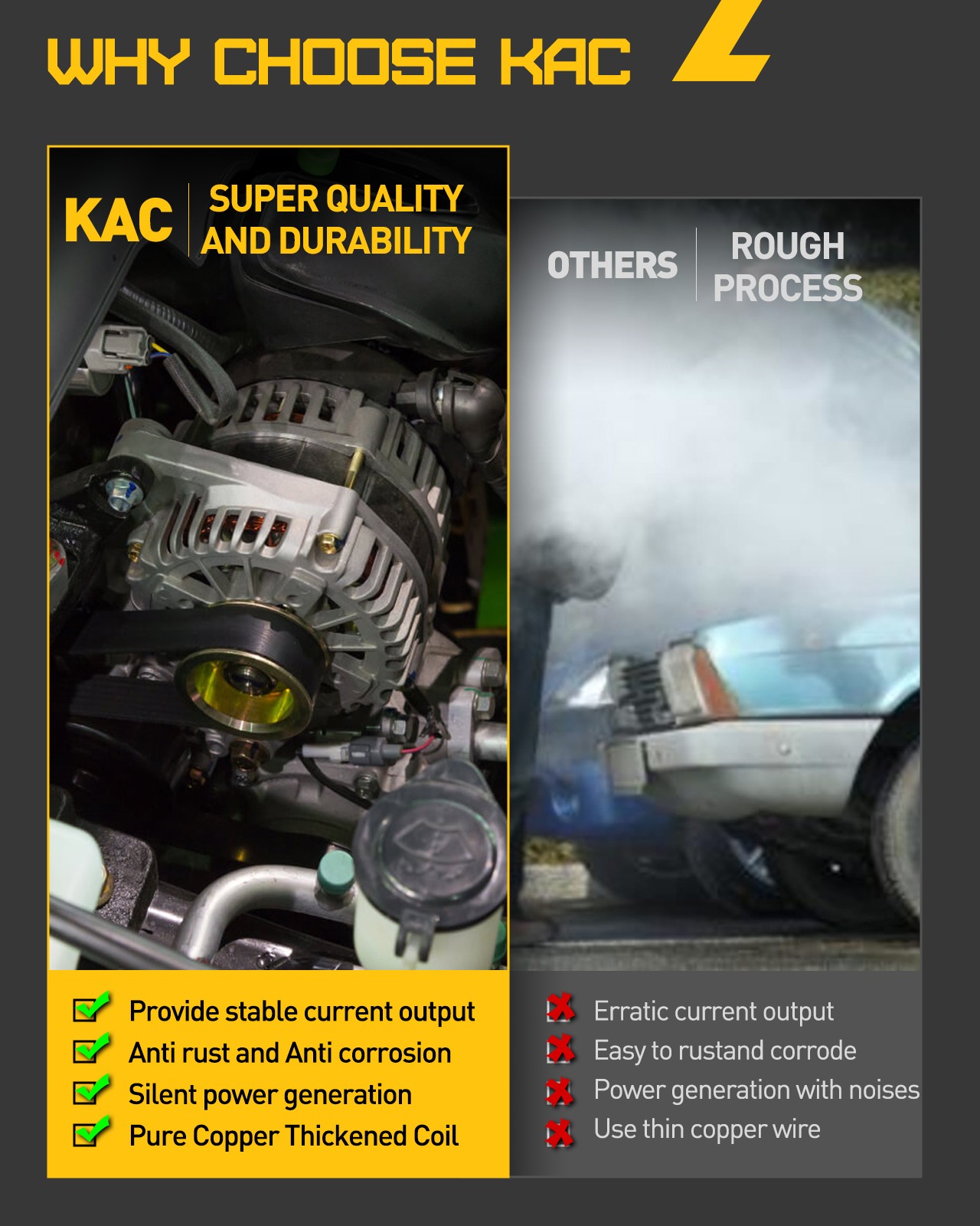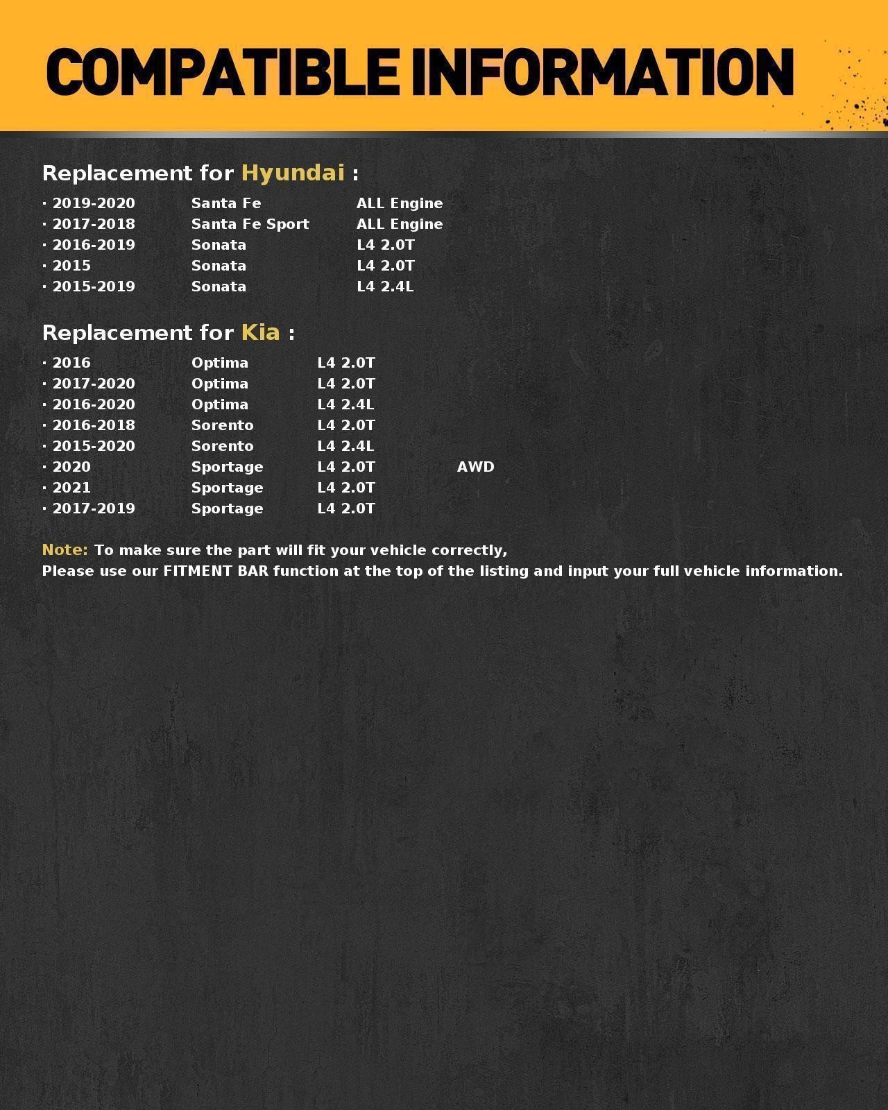 Advantages of KAC Alternator 【 Wide compatibility 】: Please confirm if your model matches this product model. 【 OE Quality 】 : A brand new Alternator manufactured by a professional OEM manufacturer according to OE specifications and ISO quality standards 【 Reliable 】: The KAC Alternator is made of high-quality materials and is a direct replacement for the original Alternator, which is consistent in structure and function with the original Alternator. 【 Easy to install 】 : The plug and play design for replacing the Alternator motor in cars does not require modification or drilling, making installation fast 【 Precautions 】: After starting the engine, the key should be turned immediately to retract the active small gear of the starter in a timely manner, in order to reduce unnecessary wear. Why choose KAC Alternator KAC Electrical makes Alternators that consistently deliver fast engine starts. Uncompromising choices in premium materials and fine craftsmanship add up to high performance and efficiency. Choose a quality-made Alternator for flawless operation and long service life. Here’s what makes our Alternator your best choice Features & Details: ROTATION: CW Design: IR/IF Brand: KAC AMP: 150 OE/OEM Part Number: 11953,42064,373002G061,1042118790,TN1042118790 Manufacturer Warranty: 5 Years Items Included: 1x Alternator - 11953N PLUG CODE: 348 Volt: 12 Groove Pulley: S6 PLUG CLOCK: 01 Key Benefits: - Designed for optimal performance, the alternator ensures reliability and efficiency for your vehicle's electrical system. - Engineered with a clockwise (CW) rotation and IR/IF design, it provides consistent power to your vehicle. - Comes with a 5-year manufacturer warranty, guaranteeing peace of mind and long-term usage. - Equipped with a 150 AMP output, providing sufficient power for various vehicle demands. Compatibility: For Hyundai: Hyundai Sonata 2015 L4 2.0T Hyundai Sonata 2015-2019 L4 2.4L Hyundai Sonata 2016-2019 L4 2.0T (Aspiration:Turbocharged) Hyundai Santa Fe 2019-2020 All engine Hyundai Santa Fe Sport 2017-2018 All engine For Kia: Kia Optima 2016 L4 2.0T Kia Optima 2016-2020 L4 2.4L Kia Optima 2017-2020 L4 2.0T (Aspiration:Turbocharged) Kia Sorento 2016-2018 L4 2.0T Kia Sorento 2015-2020 L4 2.4L Kia Sportage 2017-2019 L4 2.0T Kia Sportage 2020 L4 2.0T (DriveType:AWD) Kia Sportage 2021 L4 2.0T What's Included: 1x Alternator - 11953N Installation Guide: - Ensure the vehicle is parked on a level surface and the engine is off. Disconnect the battery before starting the installation. - Locate the existing alternator and carefully disconnect all connected cables and plugs. - Remove the mounting bolts, then detach the old alternator from the engine bay. - Position the new alternator in place, aligning it with the engine mounting points, and secure it with bolts. - Reattach the cables and plugs, ensuring a tight and secure connection. - Reconnect the vehicle battery and start the engine to test the new alternator's functionality. Important Notes: - Fits 2015-2019 Hyundai Sonata L4 2.4L, ensuring a direct replacement for the specified models. - Fits 2016-2020 Kia Optima L4 2.4L, offering compatibility for seamless installation. - Fit for 2015-2020 Kia Sorento L4 2.4L, providing a reliable power solution for your vehicle. - Verify OE numbers - 11953, 42064, 373002G061, 1042118790, TN1042118790 - for compatibility with your existing parts. - Ensure the plug code 348 and plug clock 01 match your vehicle's specifications for proper installation. Pure Copper Windings Made of high quality materials and pure copper windings. They have great electrical conductivity and magnetic properties, allowing for efficient energy conversion and long-lasting durability Precise Balancing & Calibration The rotor and stator of our alternators are accurately balanced and calibrated to minimize rotor and stator imbalance and vibration, thereby increasing generator stability and service life. Advanced Materials Rotors and alternators are made of high-performance materials such as special steels, aluminum alloys and electrically conductive materials. These materials have great thermal and electrical conductivity and mechanical strength, allowing them to remain stable at high temperatures and high operating speeds. Brand new Alternator manufactured under the guidelines of OE specifications and ISO Quality Standards by the professional OEM manufacturer, 100% computerized load and power testing for reliability, durability and performance.Maximum output and optimal performance assured. We only use top-quality components to ensure that our products offer superior performance and durability. Our rigorous quality control standards ensure that each product meets our high standards.Our Alternator can last up to 50,000 hours. This alternator has direct fit design, no vehicle modifications. Simple process for quick and easy installation. Maximum output and optimal performance assured. Payment 1) we accepts all major credit cards via PayPal: MasterCard, Visa, American Express and Discover. 2) We will only ship to the confirmed PayPal shipping address given with the payment. Please make sure your PayPal and eBay address is correct. If not, please correct it before payment. Thank you. 3) If you want to ship to another address, please change your PayPal shipping address before you make payment. 4) To avoid initiating an unpaid item claim, please pay within 7 days. 5) Custom duties, taxes, or charges are not included in the cost you pay to us. Shipping We only ship this item to United States ! 1. We ship to your eBay address. Each package will be shipped by UPS or Fedex with tracking number. 2. Ship within 1 business day once payment completed. Orders placed on weekend will be shipped within 3 days. 4. Seriously promise: Refund or resend will be offered if item still not arrive in 7-10 business days. Just send us an email ,we will give you a satisfied solution as soon as possible. Return Policy If you send us an
