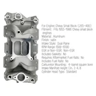 Aluminum Dual Plane Intake Manifold for Chevy 350 1955-1995 Small Block Features: Usage:Street/Hi-Performance Position:N/A Engine Make/Size:Chevy Small Block (265-400) Emission:Without EGR Cylinder Head Type:Standard RPM Range:1500-6500 EGR:Without EGR Engine Block Style:Stock/OEM standard Deck Intake Style:Dual plane Carburetor Quantity:One Intake Manifold Height (in.):4.8 Finish:Natural Material:Aluminum OE Number: 52026, 82026 Vehicle Information: ▪Chevrolet 1955-1957 V8 4.3L/265 Chevy Small Block 4-barrel square bore ▪Chevrolet 1979-1982 V8 4.4L/267 Chevy Small Block 4-barrel square bore ▪Chevrolet 1957-1967 V8 4.6L/283 Chevy Small Block 4-barrel square bore ▪Chevrolet 1967-1969 V8 4.9L/302 Chevy Small Block 4-barrel square bore ▪Chevrolet 1976-1995 V8 5.0L/305 Chevy Small Block 4-barrel square bore ▪Chevrolet 1968-1973 V8 5.0L/307 Chevy Small Block 4-barrel square bore ▪Chevrolet 1962-1969 V8 5.4L/327 Chevy Small Block 4-barrel square bore ▪Chevrolet 1967-1995 V8 5.7L/350 Chevy Small Block 4-barrel square bore ▪Chevrolet 1970-1980 V8 6.6L/400 Chevy Small Block 4-barrel square bore Package Contents: 1* Casting SBC Intake Manifold