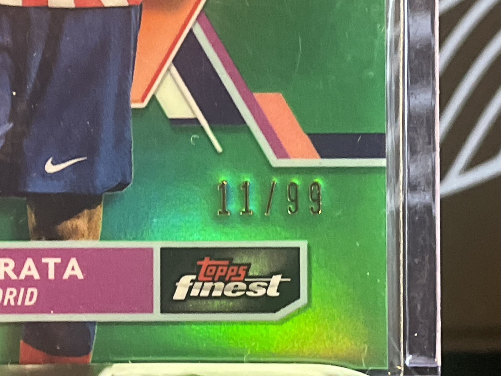 This is a 2023 Topps Finest Alvaro Morata UEFA Champions League Green Refractor trading card featuring the player for Atlético Madrid. It is serial numbered out of 99 and part of the parallel/variety set. The card number is 130, and it is manufactured by Topps. The card is not autographed and is ideal for soccer fans and collectors.
