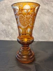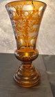 Storage unit find. I do not know much about it other than it’s an Egermann Amber Etched Vase. Has a small Chip on the rim and the bottom of the vase has scratch marks , looks like from it being moved around. Would love to keep but I do not have the room for it. Sold as is review pictures for additional details.