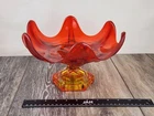 Elevate your decor with this vibrant Amberina Viking Glass pedestal bowl, standing 7 inches tall with a bold petal-shaped rim and fiery red-to-orange gradient. This retro mid-century art glass piece can serve as a stunning vase, candy dish, or centerpiece, glowing with vintage charm. Its rich hues and flared form make it a standout for collectors and fans of 1960s–70s glassware. Made by Viking Glass, it's the perfect blend of style and function. Does have a slight glow under 395nm due to cadmium. *Excellent condition!