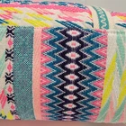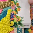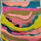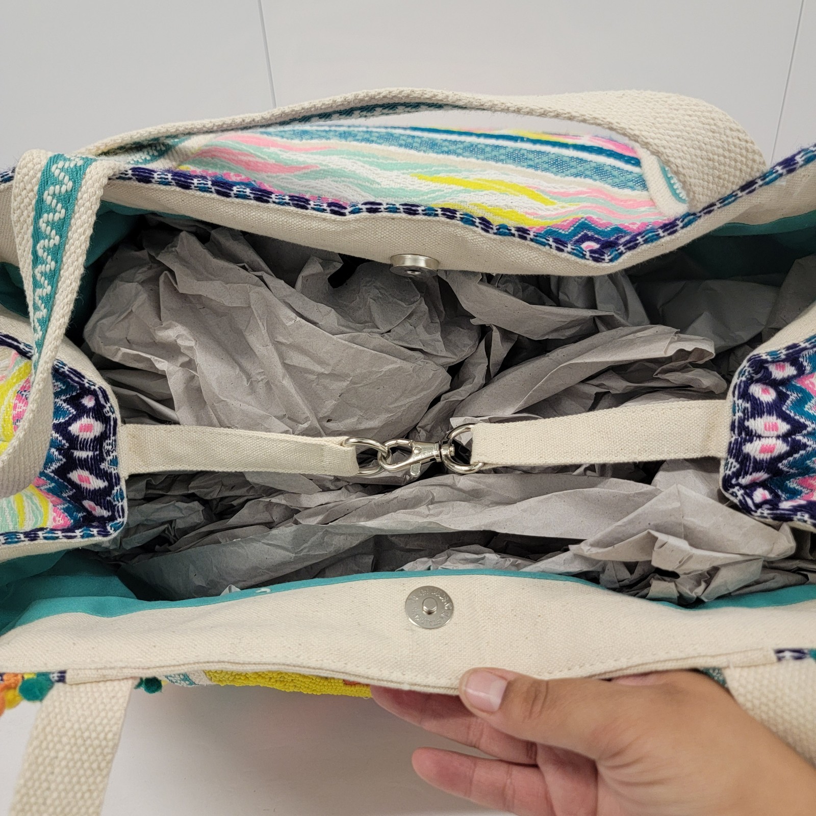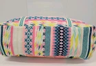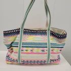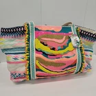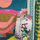 The America and Beyond DAPHNE EMBELLISHED MULTI-COLORED HAND BEADED TOTE is a large rectangular tote featuring a tropical pattern with multicolor beads. It has a snap closure and a multicolor shoulder strap handle. This artsy boho handbag is suitable for travel, parties, and casual occasions, and is adorned with silver hardware accents. Handmade with a polyester, canvas, and fabric lining, this tote is a colorful and eclectic designer piece that reflects a beachy, rainbow, and nautical theme. It also includes inner pockets for organization.