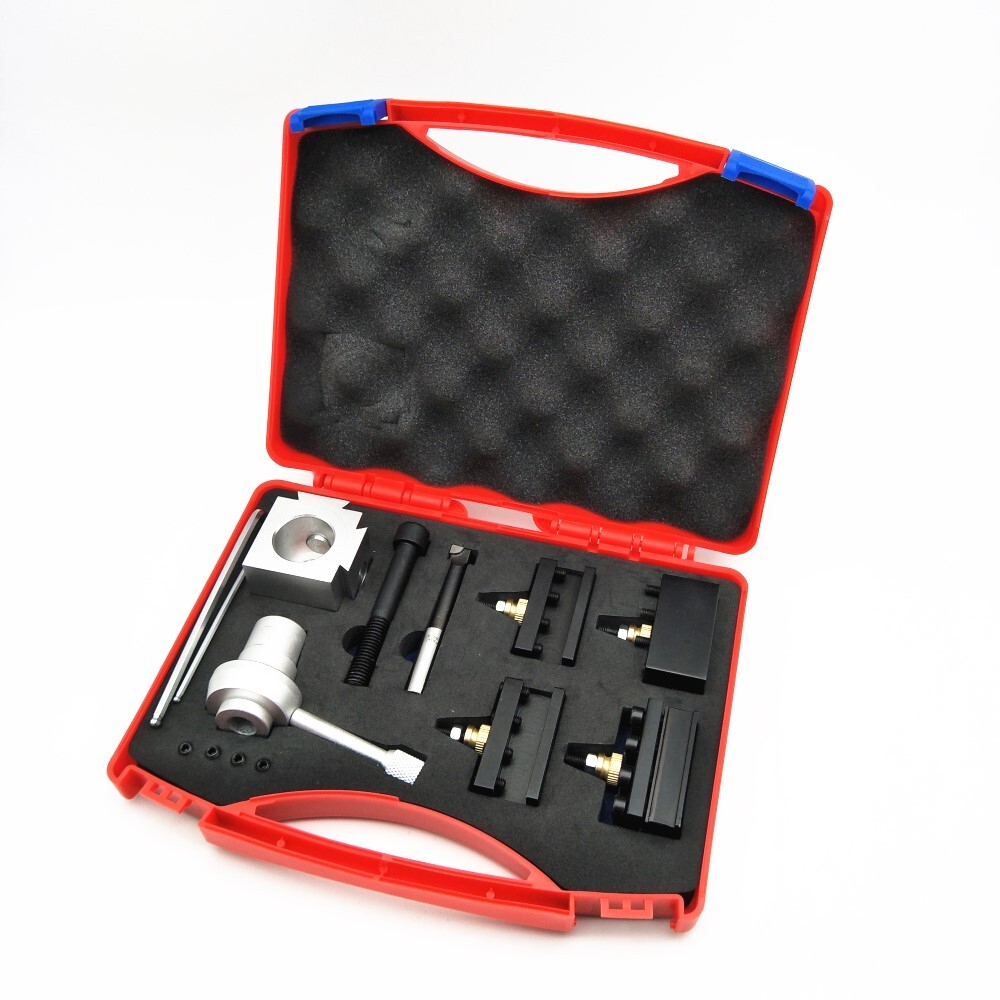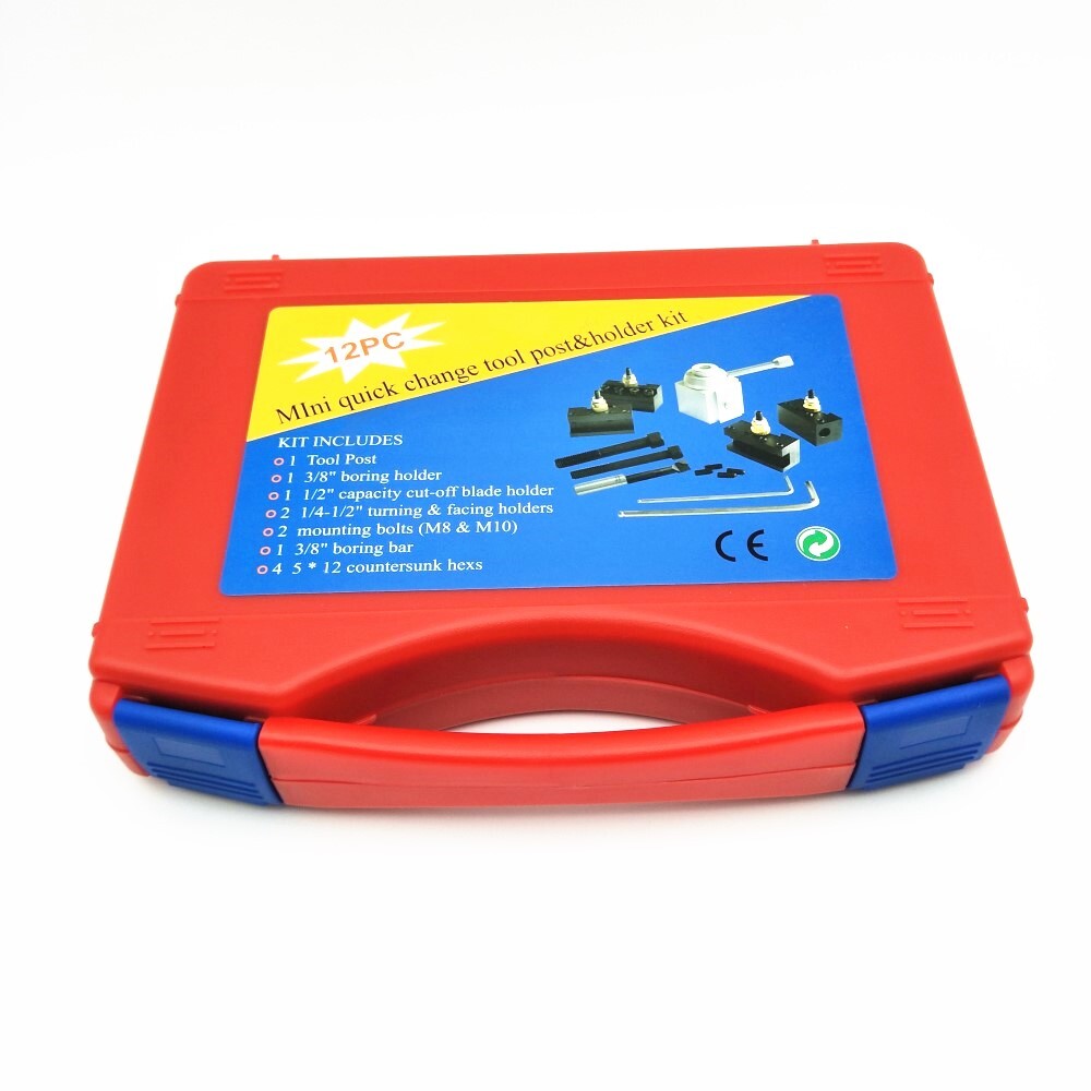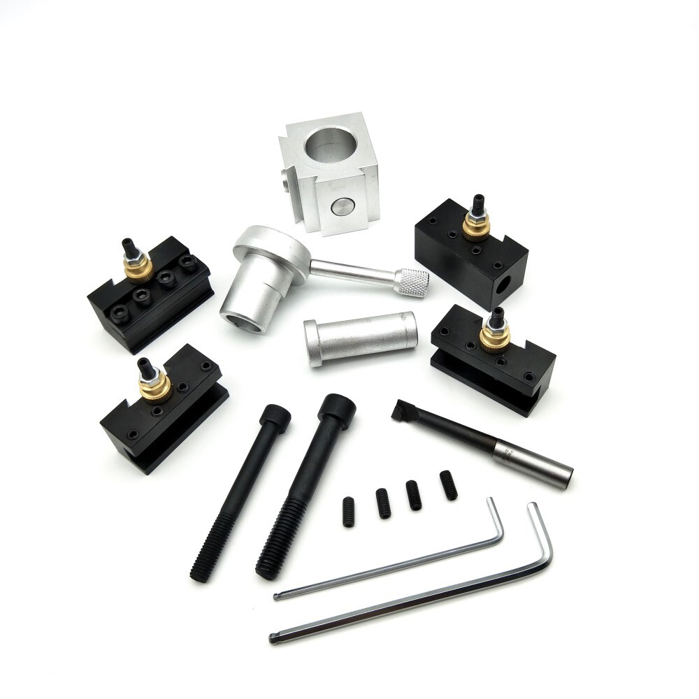 American aluminum alloy tool holder combination set Material: Aluminum alloy Full set weight: 900 g The quick change tool holder set includes: 1 cutting blade holder (1/2 "capacity cut off blade holder); 2 outer circular tool holders (1/4-1/2 "turning&fixing holders); 1 inner hole knife holder (3/8 "boring holder); 1 Tool Post 2 mounting bolts (M8&M12)