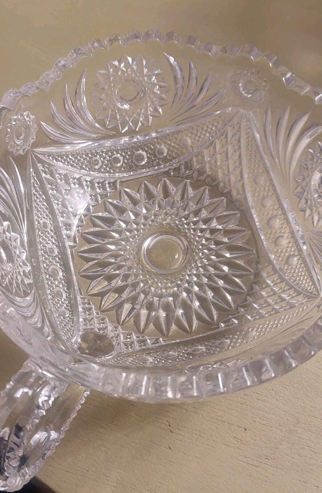 This American brilliant pressed glass candy dish boasts a beautiful ruffled sawtooth edge, adding a touch of elegance to any room. The pattern is classic and timeless, making it a perfect addition to any collection. Whether serving candy or nuts or fancy up your powder room with a sparkle. #1
