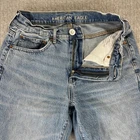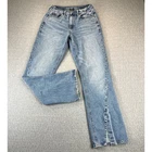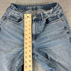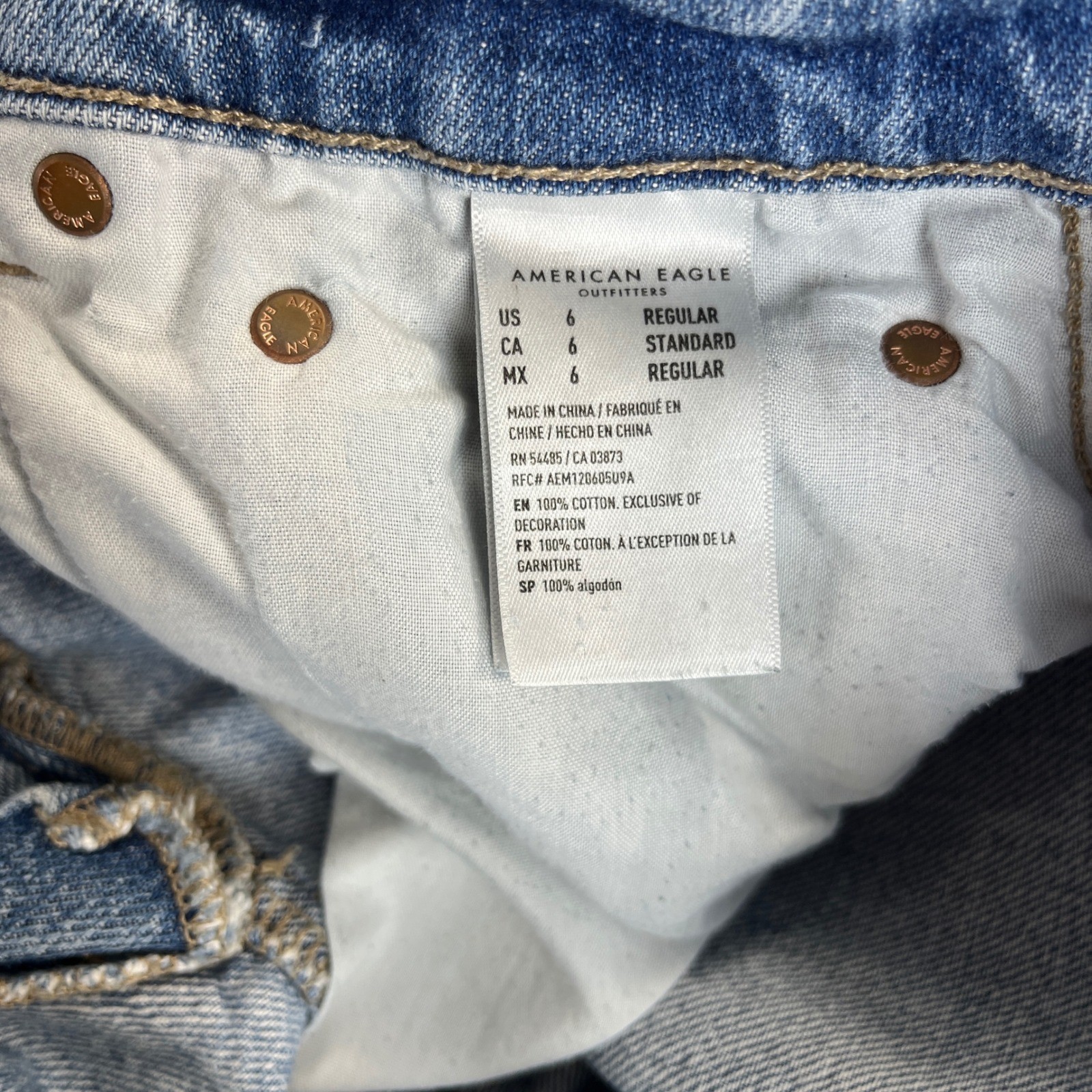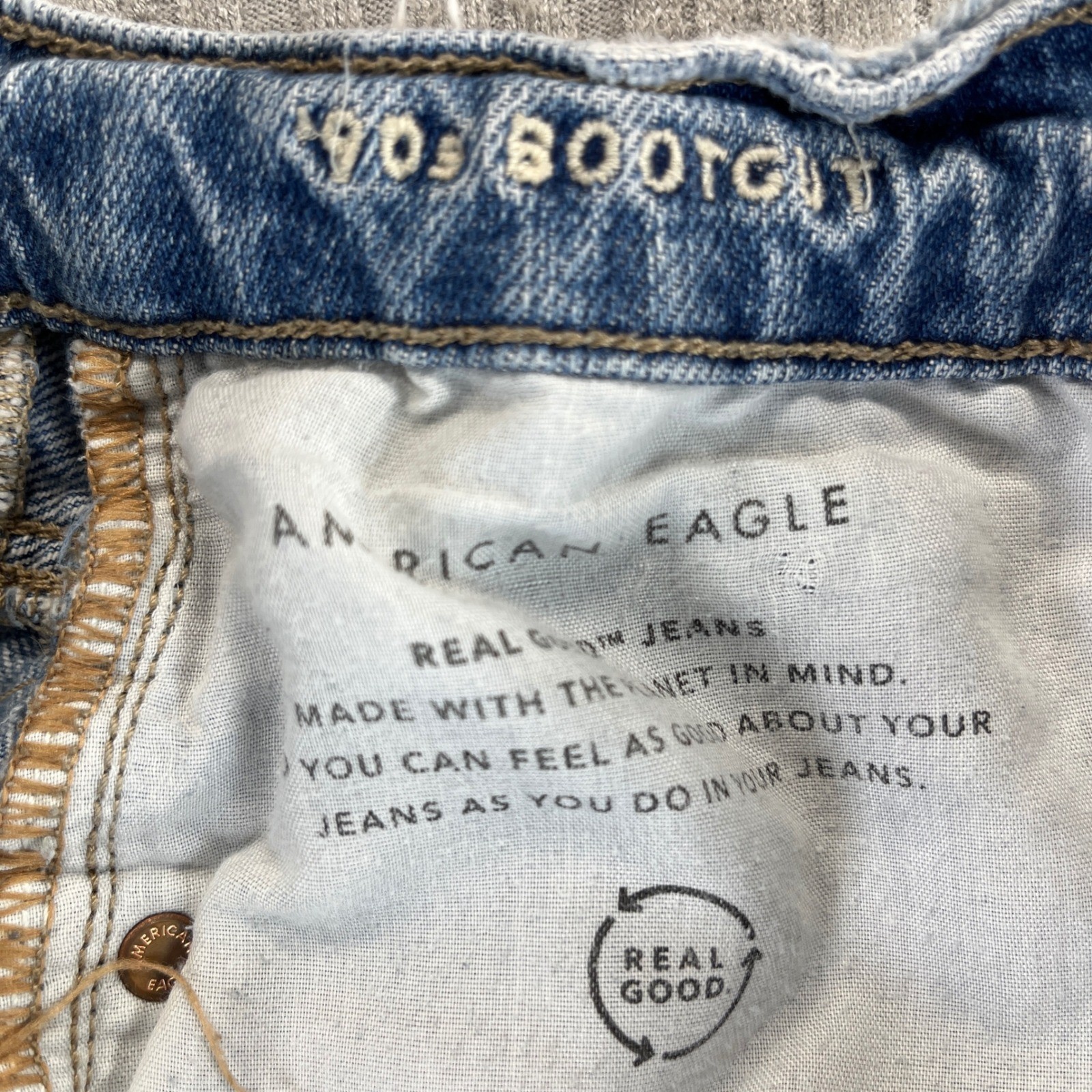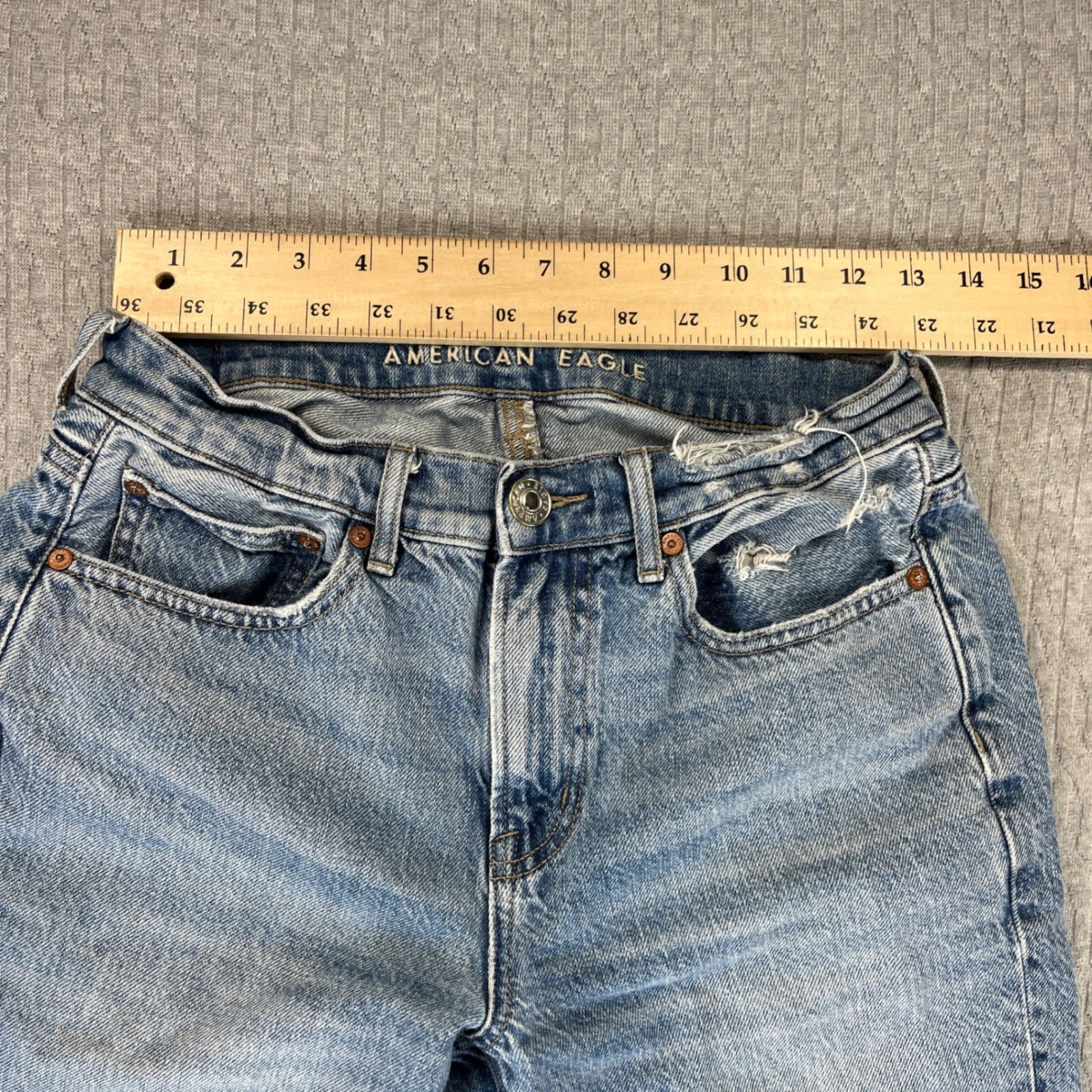 Great distressed, vintage looking condition please examine all photos for flaws, measurements and exact fit Style: Bootcut Department: Women Fabric Wash: Light Waist Size: 25 Type: Jeans Accents: Logo, Embroidered, Fringe Features: Distressed, Pockets, Slit Fit: Regular Pattern: Solid Rise: Mid (8.5-10.5 in) Fabric Type: Denim Material: 100% Cotton Closure: Button, Zip Theme: 90s, Grunge Model: 90s Bootcut Keywords: American Eagle, womens jeans, bootcut, high rise, distressed denim, light wash, split hem, casual, streetwear, denim, fashion, trendy