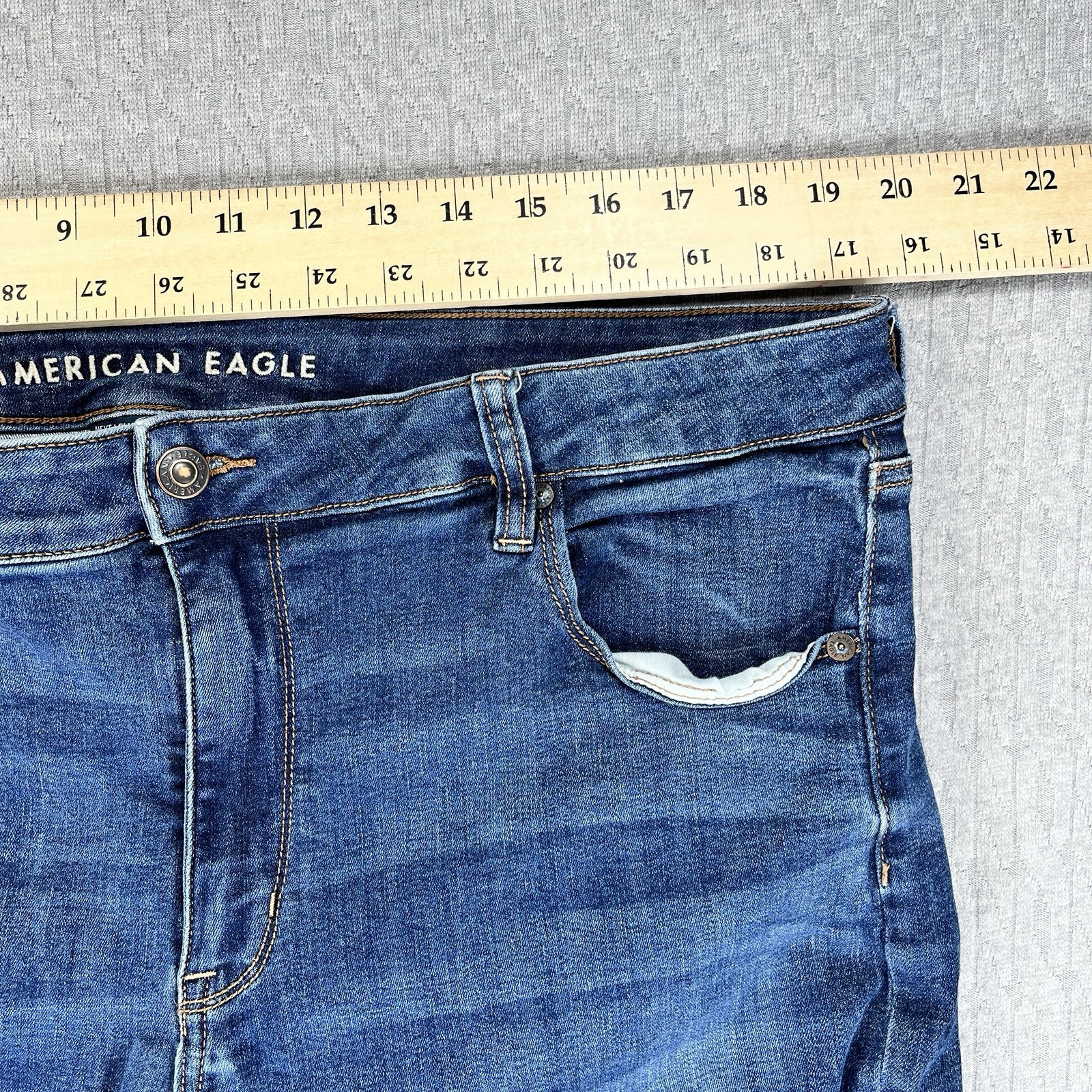 great vintage, distressed, looking condition please examine all photos for flaws, measurements and exact fit Measurements: • Waist: 39 • Style: Flared Department: Women Fabric Wash: Medium Type: Jeans Accents: Logo, Button, Zipper Features: Slit, Stretch, Pockets Fit: Regular Pattern: Solid Rise: High (Greater than 10.5 in) Fabric Type: Denim Material: Cotton Blend, Polyester Blend, Viscose, Spandex Closure: Zip, Button Theme: Logo Keywords: AE jeans, high rise, bell bottoms, stretch denim, distressed, fashion, trendy, casual wear, going out, streetwear, bootcut, cropped, vintage inspired