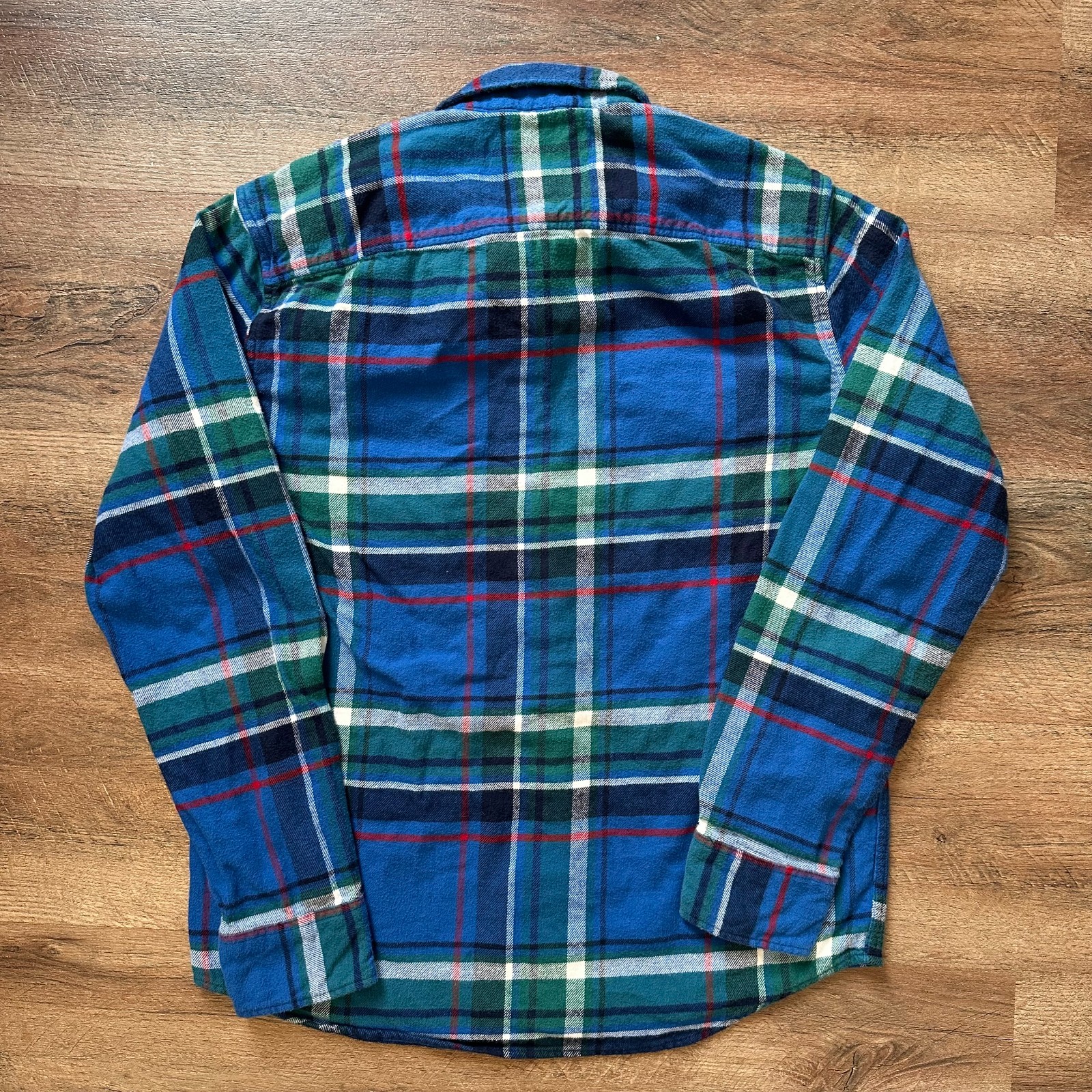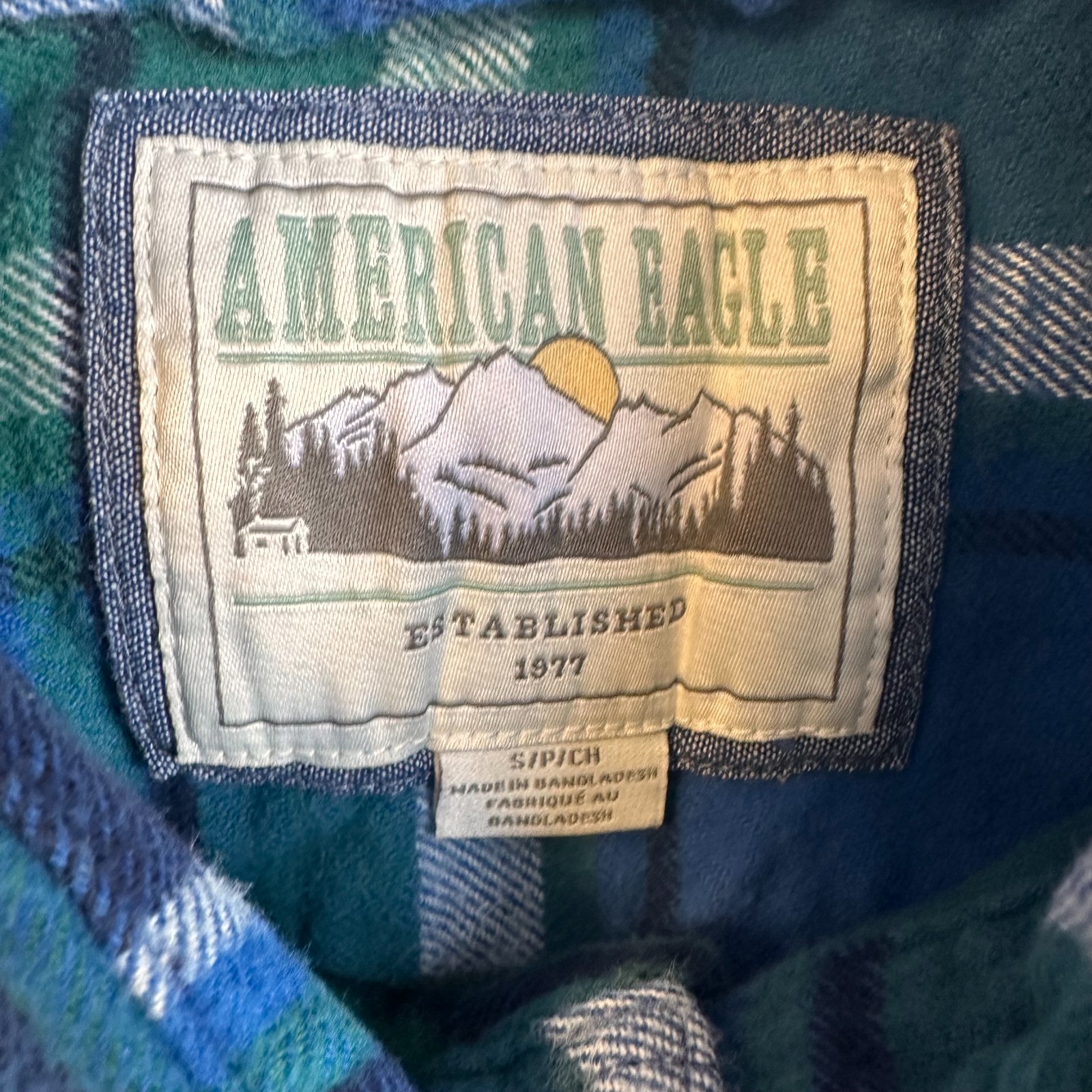 The American Eagle Casual Button Down Men's Small Blue Green Plaid Rugged Flannel Shirt is a versatile and stylish piece perfect for various occasions. Made of comfortable cotton flannel with a rugged plaid pattern, this shirt features a classic button-down collar and long sleeves. With a regular fit and chest size of 40 inches, it is suitable for all seasons and can be machine washed for easy care. The shirt also includes pockets and is adorned with button accents, making it a great choice for those who enjoy a hipster, nature-inspired, or grunge-inspired look. 20 inch chest 26 inch length