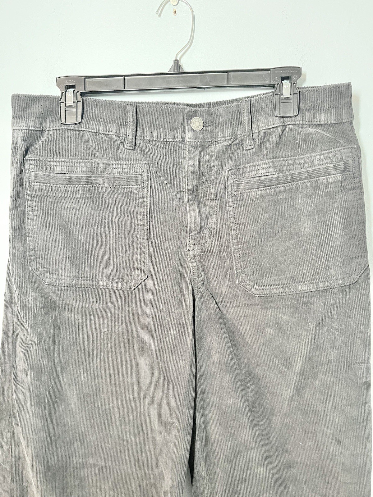 These American Eagle Corduroy Pants are a stylish and versatile addition to any woman's wardrobe. Featuring a relaxed fit with a wide-leg design, these cargo-style pants in black corduroy offer both comfort and style. With a high-rise waist and trendy accents like button and zipper closures, these pants are perfect for casual occasions and can be worn in all seasons. Made from a blend of spandex, viscose, and cotton, these pants also include convenient pockets and have a 29-inch inseam, making them a practical and fashionable choice for everyday wear.