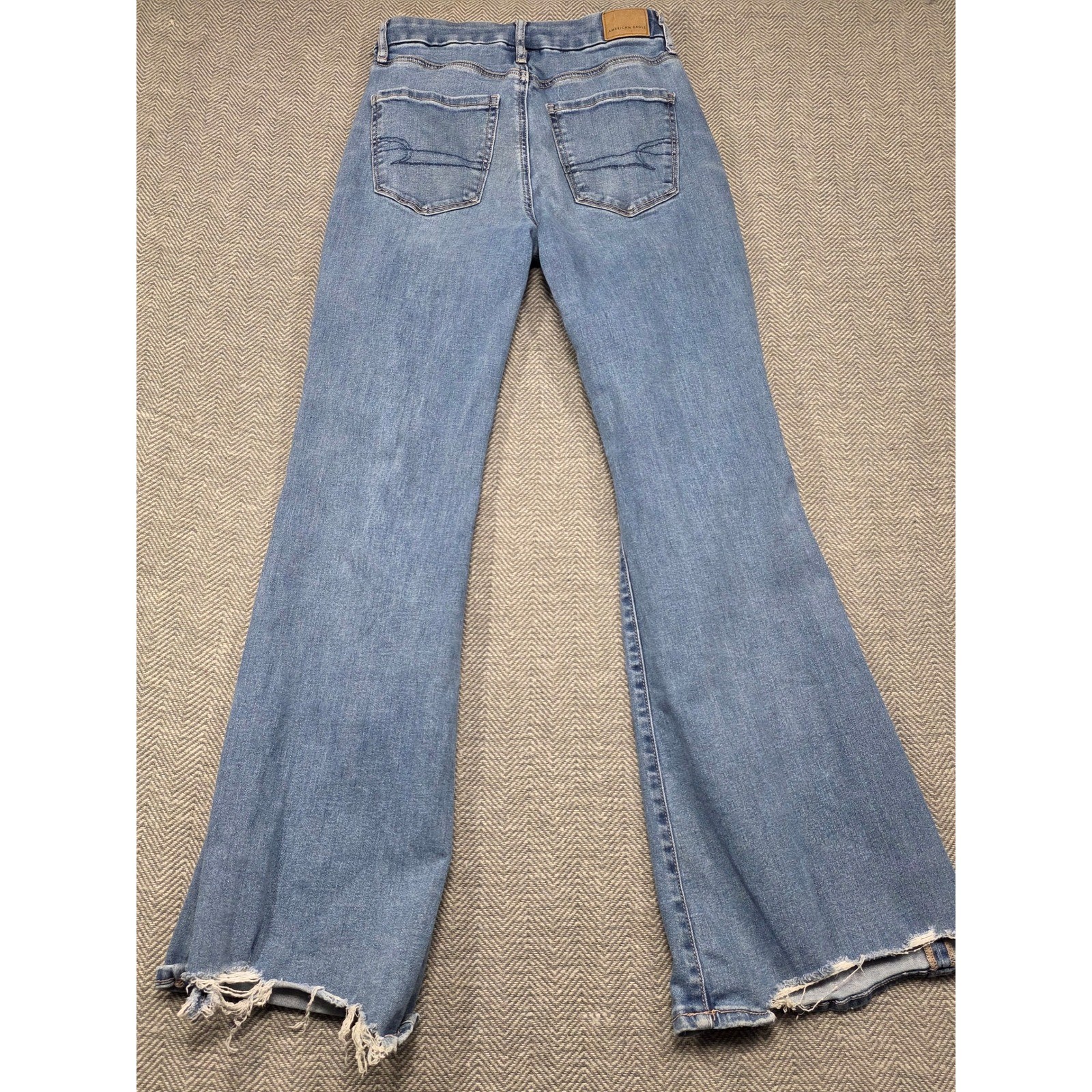 Embrace a touch of edgy style with these American Eagle Curvy Super High Rise Flare Jeans. The light wash denim is artfully distressed with rips and fraying, creating a lived-in look that adds character to any outfit. Designed to flatter your curves, the high-rise waist cinches you in while the dramatic flare leg adds a retro vibe. Perfect for a casual day out or a fun night with friends, these jeans offer both comfort and trend-setting style. Imagine yourself rocking these with a simple tee and sneakers for an effortlessly cool look or dressing them up with a stylish top and boots for a statement ensemble. Measurements: • Waist: 27 in • Inseam: 30 in • Rise: 11 in • Leg Opening: 10 in Style: Flared Department: Women Fabric Wash: Medium Waist Size: 27 in Type: Jeans Accents: Fringe Features: Distressed, Pockets Fit: Regular Pattern: Solid Rise: High (Greater than 10.5 in) Fabric Type: Denim Material: Cotton, Polyester Blend, Spandex Closure: Zip, Button Theme: 90s, Grunge, Retro, Festival Keywords: American Eagle Outfitters, high rise, flare leg, distressed denim, ripped jeans, curvy fit, stretch denim, light wash, boho, retro, casual wear, streetwear, festival fashion, everyday style Every purchase takes the BLUES away!