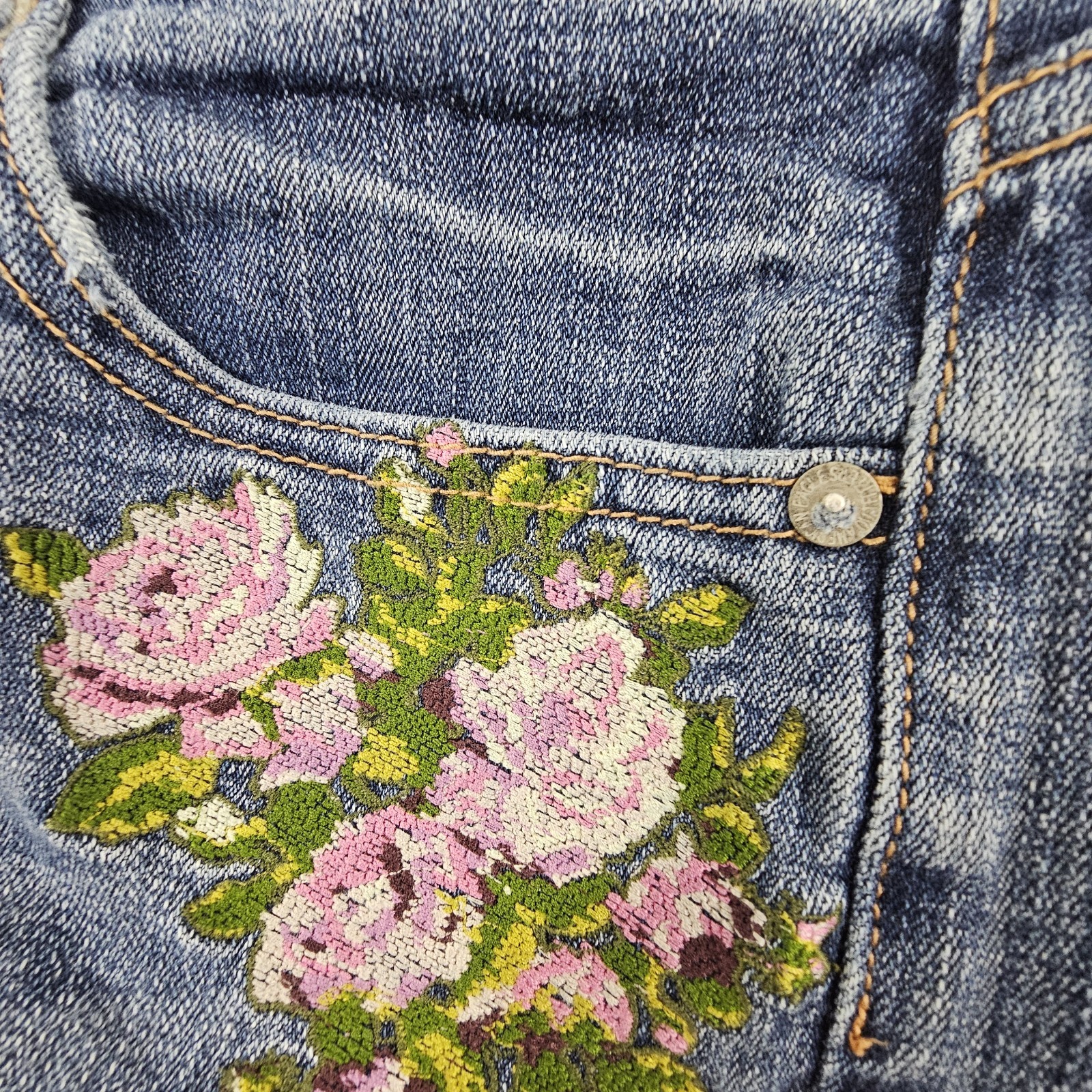 American Eagle Denim Jean Shorts Womens 0 Blue Floral Cut Off Booty Shorts Excellent pre-owned condition. No rips, tears or stains. See photos for best representation. Measures: Length 8" Waist 14.5" Inseam 2" Rise 8"