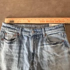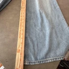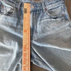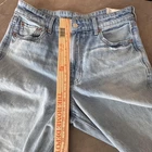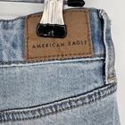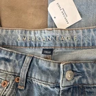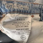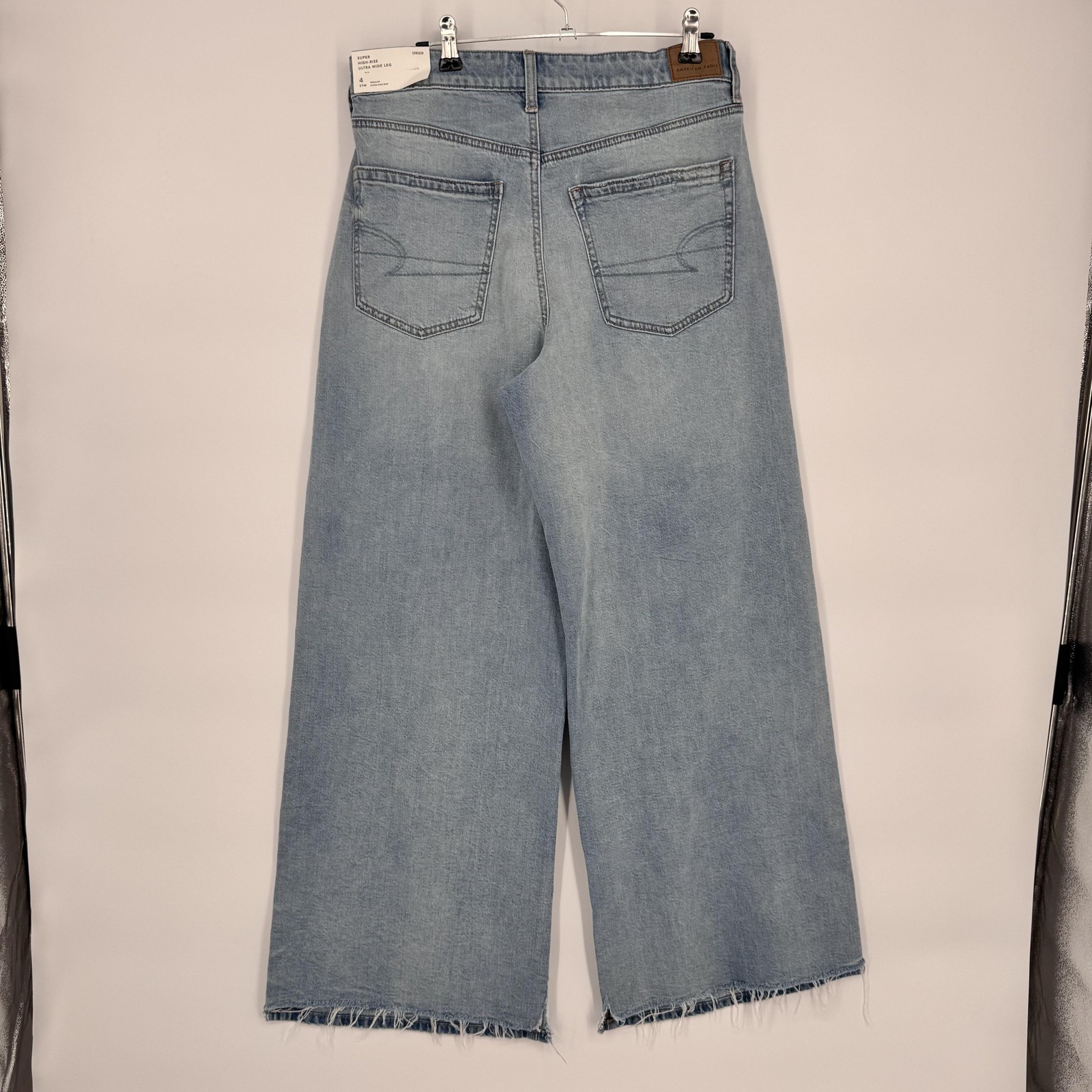 Brand: American Eagle Outfitters Item: Womens super high-rise ultra wide-leg jeans in a light blue wash denim. Size on tag: 4; waist 27W; fit noted as regular super high-rise. Color: Light wash blue with subtle fading and whiskering at the front. Design: Classic five-pocket construction with front hand pockets, coin pocket, and back patch pockets, zip fly with button closure, and belt loops at the waistband. Leg style: Ultra wide leg silhouette with cropped length and raw cut frayed hems for a distressed look. Fabric/technology: Denim with American Eagle Strigid construction, combining a soft feel with a structured look and a bit of stretch. Branding and labels: Leather logo patch at back waist reading AMERICAN EAGLE; inner waistband embroidery with AMERICAN EAGLE and SUPER HIGH-RISE ULTRA WIDE LEG; small Strigid tab at the waist. Hangtag details: Paper hangtag states SUPER HIGH-RISE ULTRA WIDE LEG, size 4 27W, regular super high-rise, Strigid; reverse side lists American Eagle branding and style No. 5537. Interior pocket print: American Eagle text with Real Good icon noting these jeans are made with the planet in mind using at least 10 percent recycled fibers, along with care suggestions to wash less frequently and avoid tumble dry. Special notes: On-trend wide-leg profile with distressed-style raw hems, ideal for casual everyday wear.